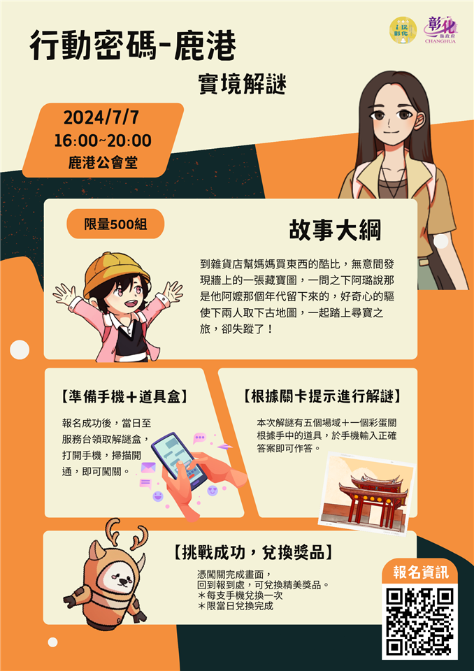 新聞焦點 發現角落小夥伴!「行動密碼‧鹿港」實境解謎遊戲今夏開催 歷史訊息 | 發布日期 2024/06/18~2024/07/18 | 發佈單位: 城市暨觀光發展處 | 發佈日期: 企劃發展科李科長 7532761 | 更新日期 2024/06/18 | 瀏覽人數: 186人 彰化縣政府今(18)日在縣府6樓新聞處前咖啡藝廊,舉辦2024小鎮光影藝術節實境解謎遊戲「行動密碼‧鹿港」宣傳記者會,活動將在暑假第一週7月7日登場,會場上展示遊戲模式與背景介紹,遊戲難易度適中,玩家需至景點觀察並找尋場域實景線索,歡迎民眾報名體驗。 城市暨觀光發展處表示,2024小鎮光影藝術節在暑假推出實境解謎遊戲,本次「行動密碼‧鹿港」實境解謎,7月7日將釋出500組名額,玩家會拿到解謎包,完成解謎任務會贈送肉包、飲料及好禮,另外,活動當天將發送1,500個角落小夥伴藍色蜥蜴燈球,其中500個保留給參加實境解謎的民眾,1,000個提供現場完成加入愛玩彰化LINE、FB打卡的民眾,活動報名從6月19日中午12點起開放報名,歡迎大家來鹿港一起體驗實境解謎。 為帶領民眾走訪鹿港及彰化景點,縣府預計今年度在愛玩彰化LINE官方帳號,推出2款以鹿港及彰化景點為場景的實境解謎遊戲,玩家們拿著實體解謎包,搭配愛玩彰化LINE就可開啟遊戲,前往各景點破解任務謎團,關卡內容巧妙融合景點特色又具有挑戰性,喜愛實境解謎的玩家們千萬不能錯過。 隨著數位科技的發展,將智慧化科技運用於觀光服務成為趨勢,本處以國人普遍使用且涵蓋率最高的LINE通訊軟體,建置愛玩彰化LINE官方帳號,作為與民眾互動的旅遊數位平台,提供活動快訊、景點、美食及小旅行路線等觀光資訊,並不定時搭配節慶活動舉辦數位集章及小遊戲,今年更開發實境解謎遊戲,期望為遊客帶來更豐富多元的旅遊體驗。 自113年6月19日12時起,於愛玩彰化LINE主選單報名介面就可報名參加「行動密碼‧鹿港」實境解謎遊戲,限量500組參加,額滿為止,每一組報名可供1-4人參與,過關完成遊戲,可領取肉包及飲品及專屬通關禮粽型零錢包(每組1份),各位大小玩家們千萬不能錯過。 2024小鎮光影藝術節展期至8月4日,歡迎大家來鹿港玩解謎、尋找角落小夥伴,踏上暑期限定的溫馨夢幻旅程,更多資訊詳情請持續關注愛玩彰化及彰化旅遊資訊網鎖定最新活動消息。 與會貴賓還有青年諮詢委員會委員洪定謙、賴宥廷、江念穎、黃日寬、彰化藝術高中老師李淳淳、奇步應用有限公司執行長陳佳新、城市暨觀光發展處長王瑩琦、新聞處長李俊德、城市暨觀光發展副處長洪世益等人。