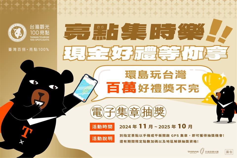 新聞焦點 暢遊彰化台灣觀光100亮點 集章任務限量千支彰化紀念雨傘等你來拿 歷史訊息 | 發布日期 2025/01/04~2025/03/09 | 發佈單位: 城市暨觀光發展處企劃發展科 | 發佈日期: 李科長 7532761 | 更新日期 2025/01/02 | 瀏覽人數: 1041人 《置頂》 彰化縣結合交通部觀光署推動「台灣觀光100亮點」,114年1月份環島月月Party活動由彰化縣擔任主打星,彰化縣政府邀請民眾前來彰化探索「台灣觀光100亮點」,包括八卦山大佛風景區、扇形車庫、鹿港老街、田尾公路花園及台灣優格餅乾學院,並搭配年度活動「2025花在彰化」、「2025員林燈會」及彰化自然生態教育中心,舉辦彰化限時批數位集章活動,實地走訪各景點深度感受彰化之美。 即日起至114年3月2日,加入愛玩彰化LINE@並掃描各景點QRcode即可完成集章,集滿兩個章即可獲得一次抽獎資格,每人最高可累計四次抽獎機會,獎項包括iPhone 15、Nintendo Switch等多項大獎,此外,集滿「2025彰化月影燈季@大佛風景區」、鹿港老街以及其他任選三個點,共計五個點,即可兌換「台灣觀光100亮點-彰化紀念雨傘」,限量1000支,換完為止,兌換時間自114年2月5日開始,上班日至本府城市暨觀光發展處兌換、假日(含國定假日)至彰化縣旅遊服務中心兌換。 彰化縣政府城觀處表示,已完成任務取得兌換資格者,點擊「兌換好禮」可察看兌換序號;此外,交通部觀光署串連各縣市舉辦「台灣觀光100亮點-環島月月Party」活動,歡迎民眾踴躍前往「台灣觀光100亮點」參加「亮點集時樂」四季抽好禮,114年1月前來彰化,還可取得「月月加碼抽」本縣所加碼的1月份獎項抽獎機會(台灣觀光100亮點-彰化紀念雨傘」50支),現在就出發吧,玩轉彰化拿好禮,為旅程留下珍貴美好的回憶。 交通部觀光署舉辦的「台灣觀光100亮點-亮點集時樂」也已開跑,活動期間至114年10月31日,集章方式透過GPS定位判定,前往台灣觀光100亮點之指定地點,開啟網頁點擊「我要集點」即可累積點數1點(同一景點每月可累積點數1次),每季將抽出「四季抽好禮」,獎項有旅遊現金1萬元、連鎖飯店住宿券等超值好禮,而在「本月主打星」期間,前往主打星縣市景點可再額外獲得點數1點,並解鎖該縣市「月月加碼抽」的抽獎機會。 最新詳細資訊,請關注旅遊資訊網或愛玩彰化臉書粉絲專頁。