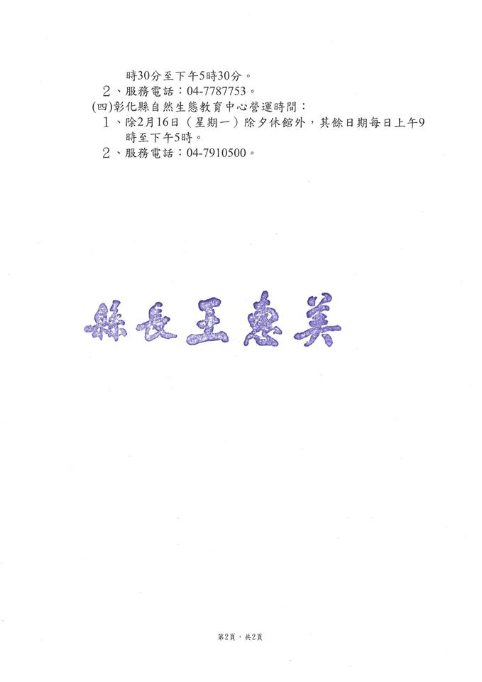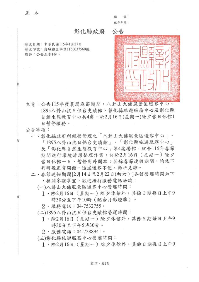 新聞焦點 八卦山大佛風景區遊客中心、1895八卦山抗日保台史蹟館、彰化縣旅遊服務中心及彰化縣自然生態教育中心共4處 春節假期營運時間 發布日期 2026/02/09~2026/02/22 | 發佈單位: 城市暨觀光發展處企劃發展科 | 發佈日期: 李科長 7532761分機2761 | 更新日期 2026/02/03 | 瀏覽人數: 26人 《置頂》 彰化縣政府經營管理之「八卦山大佛風景區遊客中心」、「1895八卦山抗日保台史蹟館」、「彰化縣旅遊服務中心」及「彰化縣自然生態教育中心」等4處場館,配合115年春節期間進行環境清潔整理作業,訂於2月16日(星期一)除夕當日休館一日,暫停對外開放;其餘春節連假期間,均依下列時段正常開館,造成遊客不便,尚祈見諒。 春節連假期間[2月14日至2月22日(初六)]各館營運時間如下,相關參觀事宜,歡迎撥打服務電話洽詢: 1.八卦山大佛風景區遊客中心 ●營運時間:除2月16日(星期一)除夕休館外,其餘日期每日上午9時30分至下午10時(配合月影燈季)。 ●服務電話:04-7532755。 2.1895八卦山抗日保台史蹟館 ●營運時間:除2月16日(星期一)除夕休館外,其餘日期每日上午9時30分至下午5時30分。 ●服務電話:04-7288941。 3.彰化縣旅遊服務中心 ●營運時間:除2月16日(星期一)除夕休館外,其餘日期每日上午9時30分至下午5時30分。 ●服務電話:04-7787753。 4.彰化縣自然生態教育中心 ●營運時間:除2月16日(星期一)除夕休館外,其餘日期每日上午9時至下午5時。 ●服務電話:04-7910500。