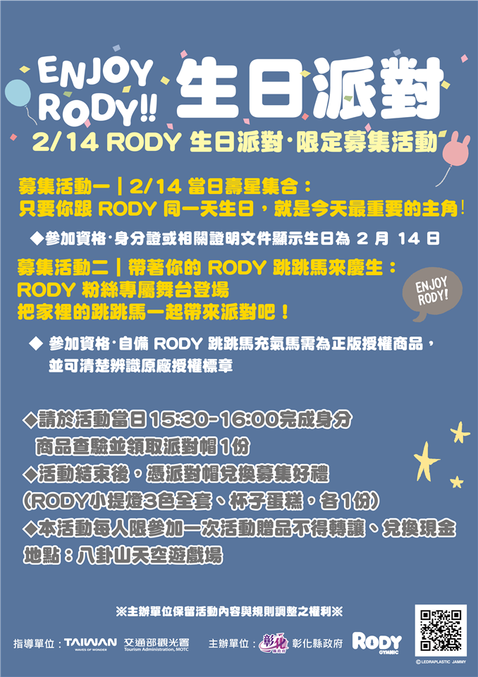 新聞焦點 2/14一起為Rody慶生!「2026彰化月影燈季」生日派對壽星與跳跳馬熱情募集 發布日期 2026/02/09~2026/03/04 | 發佈單位: 城市暨觀光發展處行銷推廣科 | 發佈日期: 張專員 7532776 | 更新日期 2026/02/04 | 瀏覽人數: 32人 《置頂》 為歡慶人氣「2026彰化月影燈季」合作IP─跳跳馬Rody生日,彰化縣政府將於2月14日(星期六)在熱度持續升溫的「八卦山天空遊戲場」舉辦「Rody生日派對」。適逢情人節,彰化縣長王惠美邀請親子家庭、好友與情侶一同賞燈、拍照打卡,在璀璨燈海中與Rody共度溫馨難忘的歡樂時光。 活動規劃Rody見面會、精采的小丑魔術秀,讓大小朋友近距離互動合影,留下專屬生日回憶,並於16:00起發放Rody IP專屬小提燈。除廣受喜愛的粉色與藍色款式外,本次更特別推出驚喜黃色款,採隨機發送方式,增添蒐藏樂趣與現場驚喜感,機會難得,絕對不能錯過。 此外,為提升活動參與趣味性,只要在當日15:30-16:00參加任一項募集活動,完成報到並查驗,就可以直接獲得Rody IP 小提燈1組(3 色全套)及 Rody 生日杯子蛋糕 1 份: 募集活動一|2/14當日壽星集合:出示與 Rody 同一天2/14生日的身分證或相關證明文件。 募集活動二|帶著你的Rody 跳跳馬來慶生:自備正版授權標章 的 Rody 跳跳馬充氣馬到場。 以上發放Rody IP專屬小提燈、募集活動皆為限量提供,發完即止。 誠摯邀請大、小朋友把握機會參與,2月14日情人節不只說「我愛你」,也一起對Rody說「生日快樂」,到彰化看燈、領小提燈、拍美照,留下滿滿的溫暖與笑容。更多活動詳情,請至活動官網或「愛玩彰化」臉書粉絲專頁查詢。