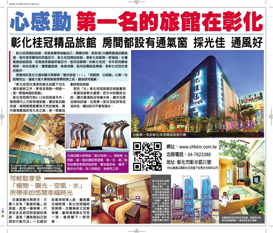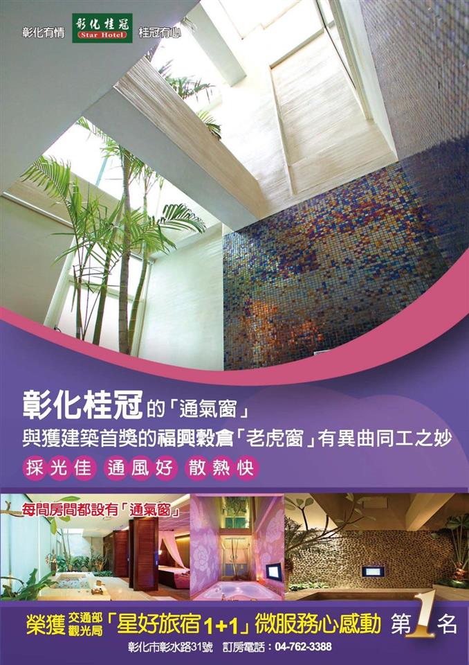 其他活動 #會呼吸的星級旅館💫 彰化桂冠精品旅館 歷史訊息 | 發布日期 2023/05/29~2023/06/29 | 發佈單位: 城市暨觀光發展處 | 發佈日期: 鄭科長 7532791分機2791 | 更新日期 2023/05/29 | 瀏覽人數: 126人 #會呼吸的星級旅館💫 彰化桂冠精品旅館 融合了大自然元素的獨特設計 23間完全不相同的主題,配合現代化的牛奶浴和最豐富的天然植栽景觀(有六米、九米、十三米的挑高天井),天井上有通氣窗,熱氣往上升,形成一間會自動呼吸換氣的樂活旅館! 🏅為全國第一家榮獲ISO 9001:2015國際最高品質認證的旅館,並於觀光局舉辦"幸福旅宿.百種感動"榮獲國內百大感動旅館獎.以及星好旅宿1+1"微服務.心感動"活動獲選 "第一名旅館" 🏅網紅展榮展瑞受交通部觀光局邀請來此與粉絲同樂,直播推廣彰化唯一榮獲『時尚美學之星』彰化桂冠旅館。 #彰化縣旅館051號