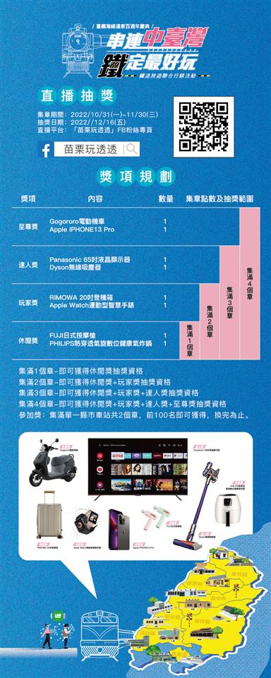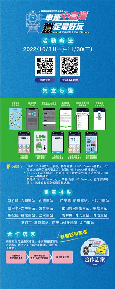 新聞焦點 「串連中臺灣 鐵定最好玩」七縣市攜手推廣鐵道旅遊 歷史訊息 | 發布日期 2022/10/11~2022/11/11 | 發佈單位: 城市暨觀光發展處 | 發佈日期: 陳科長 (04)7532781 | 更新日期 2022/10/11 | 瀏覽人數: 168人 彰化縣、台中市、新竹縣、苗栗縣、南投縣、雲林縣及嘉義市等中臺灣區域治理平台七縣市攜手推動「串連中臺灣 鐵定最好玩」活動,更結合交通部台鐵局「臺鐵海線通車百週年慶典」活動,臺鐵局規劃在10月11日駕駛DT668蒸汽火車,從彰化出發,來到苗栗通霄火車站辦理聯合行銷記者會,彰化縣副縣長林田富代表縣長王惠美與其他六縣市首長或代表,一同推廣鐵道旅遊,鼓勵遊客來中部各縣市觀光。 彰化做為臺鐵海線的起迄站,下半年將有精彩活動接力登場, 10月份卦山大縱走、彰化詩歌節及彰化旅行家·慢城老店小旅行,11月份二水國際跑水節及蒸汽火車之旅,12月份月影燈季等,因此邀請全國鄉親來場西部鐵道之旅,無論是從彰化出發或當成終點,鐵定是最棒的選擇。 1922年,臺灣海線通車也是彰化扇形車庫啟用,時至2022年迎來百周年慶典,除了在今年7月正式升格為國定古蹟的「彰化扇形車庫」外,還有其他許多受民眾喜愛的觀光旅遊勝地,包含海線百年日式檜木建造車站、鐵路舊山線、虎尾糖廠五分車、阿里山森林鐵道等,期望透過中臺灣串連「鐵道旅遊」之主題帶動周邊旅遊效益。 城市暨觀光發展處表示,彰化縣既是山海線鐵道的交會處,也是中部鐵路運轉中心,一直以來積極拓展鐵路觀光資源,在「2020二水國際跑水節」,讓睽違已久的CK24蒸氣火車亮相迎賓後,今年8月也與交通部觀光局合辦「2022扇庫百年暨鐵道系列活動」,推出令人矚目的「DT668蒸汽火車小旅行活動」。 此次,運用中臺灣區域治理平台的良好運作制度,結合臺鐵局辦理「臺鐵海線百週年慶典」,讓DT668蒸汽火車伴海馳騁,也推出7縣市14個車站Line智慧集章活動,收集越多章就有更多機會抽到大獎,及車站周邊特色店家提供獨家限量優惠,鼓勵遊客來到中臺灣進行鐵道旅遊。