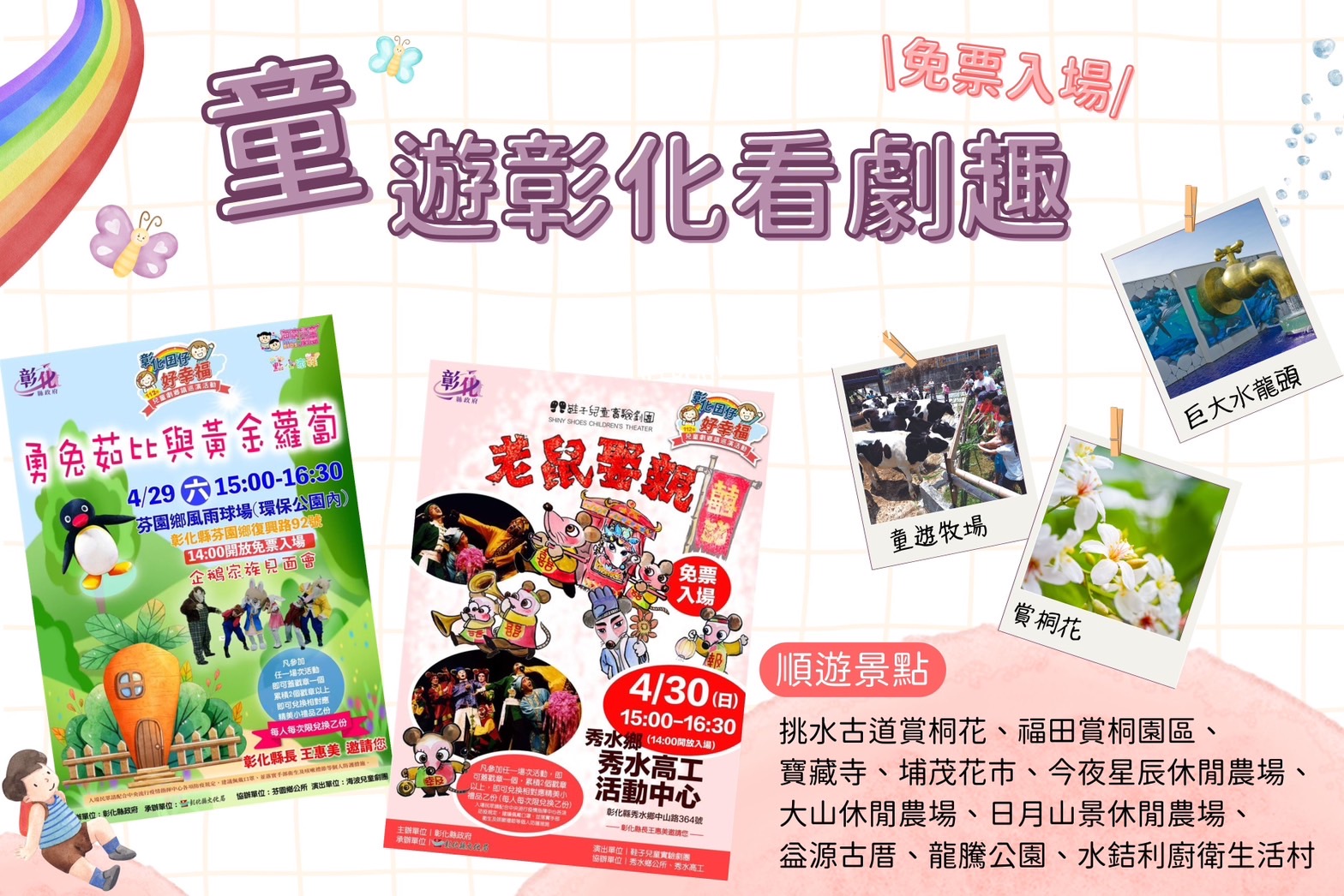 活動快訊 \🎪童遊彰化看劇趣/ #大手牽小手出遊啦 歷史訊息 | 發布日期 2023/04/28~2023/05/28 | 發佈單位: 城市暨觀光發展處 | 發佈日期: 卓小姐 (04)7250057#1760 | 更新日期 2023/04/28 | 瀏覽人數: 119人 \🎪童遊彰化看劇趣/ #大手牽小手出遊啦 五一連假怎麼玩呢! #玩景點看免費表演🤩 這週末的精彩表演在芬園、秀水登場啦!一定不能錯過的桐花季,大手牽小手散步油桐花毯🚗再到週邊的休閒農場體驗餵牛吃草喝ㄋㄟㄋㄟ~🍼還有可愛動物草泥馬、兔子等一起玩~也超推薦寓教於樂的親子景點 #水銡利觀光工廠 看世界最大的水龍頭,還能學習各種水知識💦 — 海波兒童劇團《勇兔茹比與黃金蘿蔔》 ♦️時間:4月29日(星期六)下午3點 ♦️地點:芬園環保公園內風雨球場 — 鞋子兒童實驗劇團《老鼠娶親》 ♦️時間:4月30日(星期日)下午3點 ♦️地點:秀水高工活動中心