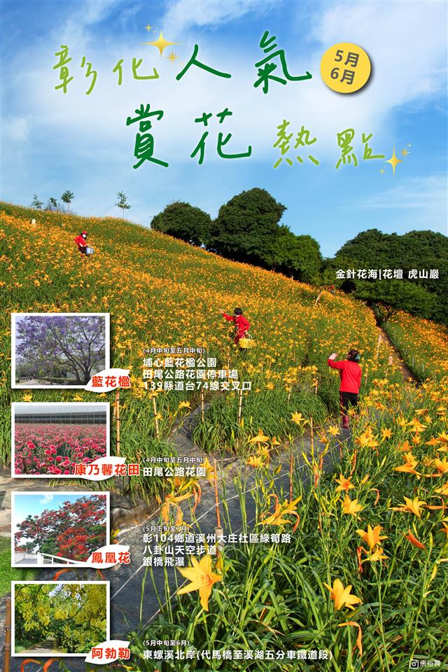 活動快訊 ⋆* ⁑⋆*𝙏𝙧𝙖𝙫𝙚𝙡 𝘾𝙝𝙖𝙣𝙜𝙝𝙪𝙖 ⋆* ⁑⋆* 5-6月人氣賞花熱點 #漫漫彰化花海📷 歷史訊息 | 發布日期 2023/05/08~2023/06/30 | 發佈單位: 城市暨觀光發展處 | 發佈日期: 李科長 (04)7532761 | 更新日期 2023/05/08 | 瀏覽人數: 132人 🌼初夏的陽光與微風吹拂🚲 把花兒的姿態襯托得更迷人了~ 虎山巖的金針花海與田尾的康乃馨花田已經開好開滿啦😍 #母親節 前帶媽咪旅遊彰化賞母親之花吧! #擁抱辛勤的媽咪 拍一張最美的合照💃 ✨收藏彰化賞花情報✨ 任何美的地方都會不錯過! — #金針花海|花壇虎山巖 #藍花楹| 埔心藍花楹公園、田尾公路花園停車場、139縣道與台74線交叉口 #康乃馨花田|田尾公路花園 #鳳凰花|彰104鄉道溪洲大庄社區綠筍路、八卦山天空步道、銀橋飛瀑 #阿勃勒|東螺溪北岸(代馬橋至溪湖五分車鐵道段)