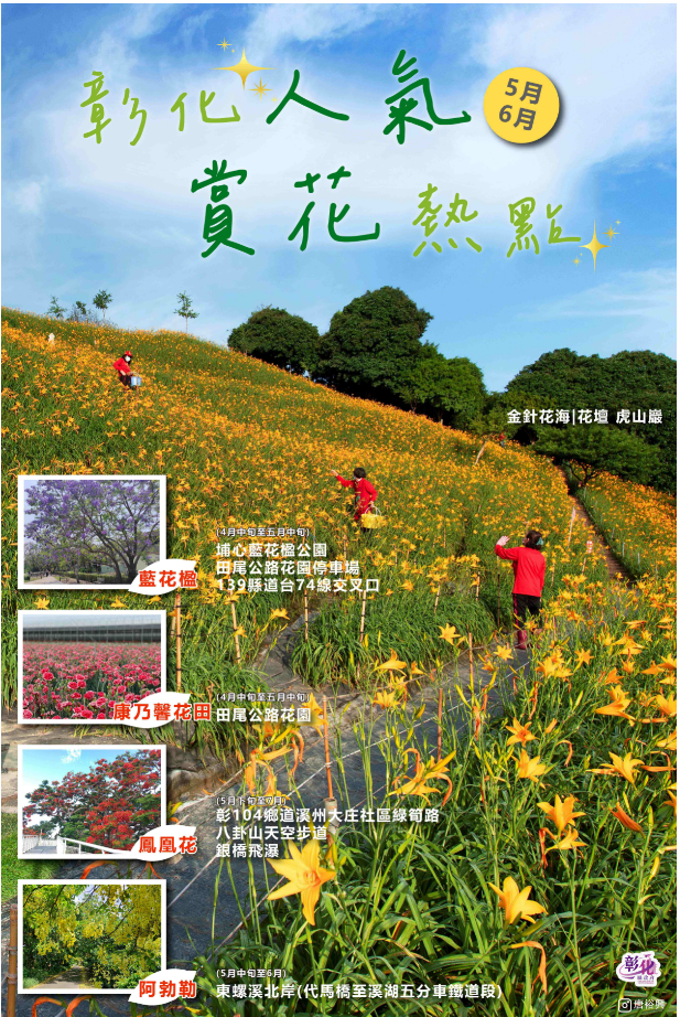 新聞焦點 滿版金黃色花毯襲來!5、6月彰化賞花攻略 歷史訊息 | 發布日期 2023/05/12~2023/06/30 | 發佈單位: 城市暨觀光發展處 | 發佈日期: 李科長 (04)7532761 | 更新日期 2023/05/10 | 瀏覽人數: 130人 5、6月花在彰化美麗綻放,溫暖多雨的季節來臨,梅雨紛飛,多處浪漫花海賞花秘境大蒐羅,彰化縣長王惠美邀您抓緊這個時節,在初夏清風中,來彰化賞花賞景。 比花東金針花季早,不用到花東,現在來彰化花壇虎山巖就可欣賞爆滿的金黃色「金針花」,三萬多株已盛開,壯麗花海景象被網友譽為「5月份最佳賞花點」,也提醒大家,愛它就不要踩踏它,花期預計到6月初。 賞花同時順遊「茉莉花壇夢想館」,也是另一個IG打卡熱點;仙氣爆棚的浪漫藍紫色「藍花楹」在田尾、埔心,花期預計在5月中,盛開時紫色喇叭狀的花瓣隨風飄落,讓地面猶如紫色花毯般迷人。全台最大的「康乃馨」花田在田尾公路花園,夢幻漸層粉色絕美好拍,在感恩母親的時節裡要獻給媽媽。 5、6月份即將迎來畢業季,是「鳳凰花」與「阿勃勒」花開的日子,鳳凰花點綴在八卦山天空步道樹冠層及銀橋飛瀑等地,賞花同時可在天空步道漫步山林,欣賞山林勃勃生機及高空視野,賞完花可來卦山村美學生活聚落探訪職人手作,以及鐵道迷的最愛國定古蹟扇形車庫,品嚐彰化享譽全台的美食肉圓、爌肉飯。 素有黃金雨之稱的「阿勃勒」,在東螺溪北岸,二林的阿勃勒花道,滿樹成串的金黃色風鈴高掛,花瓣飄落,行走於樹下猶如沐浴在黃金雨般夢幻,賞完花來到慈恩休閒農場可DIY農特產小點心,去溪湖糖廠吃冰搭乘小火車欣賞田野風光。 彰化是花的故鄉,一年四季花期不間斷,更多最新花況及旅遊活動就在「彰化旅遊資訊網」https://tourism.chcg.gov.tw 或「愛玩彰化」臉書粉絲專頁及IG即時更新推薦。