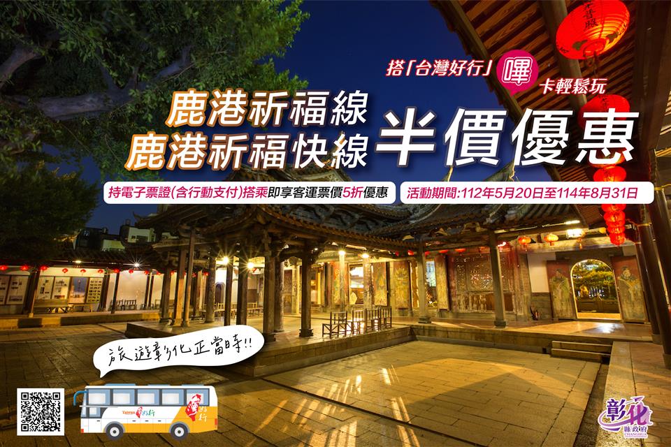 新聞焦點 鹿港祈福線半價優惠~旅遊彰化正當時 歷史訊息 | 發布日期 2023/05/24~2023/06/24 | 發佈單位: 城市暨觀光發展處 | 發佈日期: 李科長 7532761 | 更新日期 2023/05/24 | 瀏覽人數: 148人 隨著COVID-19疫情趨緩及國境解封,為鼓勵各地遊客搭乘台灣好行等大眾運輸工具暢遊彰化,即日起至2025年8月31日止,不分平假日,可使用QR Code乘車碼支付,包括一卡通、悠遊卡、iCash等,或以行動支付(一卡通MONEY、悠遊付、icash Pay等)搭乘台灣好行鹿港祈福線(含快線),即享半價優惠! 彰化縣目前營運的台灣好行-鹿港祈福線(含快線)深受遊客喜愛,充滿歷史藝文氣息的鹿港老街是絕對不能錯過的景點,假日時可感受到鹿港往昔「千帆入港」的繁榮景象,平日時則能漫步走在古樸的紅磚巷中,細細回味穿越時空的寧靜。而彰濱的觀光工廠不論是知名的白蘭氏健康博物館,或別具趣味的緞帶王觀光工廠,還是晶瑩剔透的台灣玻璃館,都令遊客留下難以忘懷的體驗。 彰化縣政府城市暨觀光發展處表示,交通部觀光局推出「觀光景點公共運輸接駁方案」,優化台灣好行服務,持電子票證(含行動支付)可享半價優惠,民眾可以善用台灣好行-鹿港祈福線(含快線)規劃小旅行,暢玩鹿港古鎮及建縣300年的彰化,搭配體驗觀光工廠,再品嚐在地特色的美食,真的好吃好玩又有料,旅遊彰化正當時。台灣好行票價半價優惠相關資訊及參與路線,請詳見台灣好行旅遊服務網: https://www.taiwantrip.com.tw/