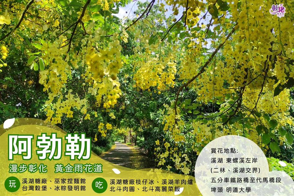 活動快訊 #漫步彰化 阿勃勒浪漫花道 歷史訊息 | 發布日期 2023/06/12~2023/07/12 | 發佈單位: 城市暨觀光發展處 | 發佈日期: 李科長 7532761分機2761 | 更新日期 2023/06/12 | 瀏覽人數: 120人 #漫步彰化 阿勃勒浪漫花道 盛夏的微風中正下著金燦燦的黃金雨~💛 假日小旅行 #浪漫花季限定 沿著東螺溪河畔,騎著自行車欣賞阿勃勒盛開的美景🚲~金黃色的花瓣隨風飄逸,一旁悠閒的田園景致徹底洗滌工作上的疲憊,假日就該這樣放鬆,來趟東螺溪自行車之旅吧!暫別城市的喧囂,騎著單車🚴吃著溪湖糖廠涼涼的冰,享受大自然的美~🥰 #溪湖 ✿東螺溪✿ 📍東螺溪左岸五分車鐵路橋至代馬橋段(二林、溪湖交界) #埤頭 ✿明道大學✿ 📍彰化縣埤頭鄉文化路369號