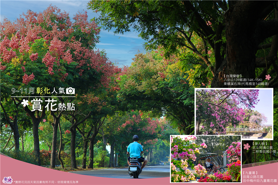新聞焦點 限時搶拍!彰化9-11月超人氣賞花熱點美翻 歷史訊息 | 發布日期 2023/09/08~2023/10/08 | 發佈單位: 城市暨觀光發展處 | 發佈日期: 李科長 7532761分機2761 | 更新日期 2023/09/05 | 瀏覽人數: 137人 夏末初秋的彰化,花兒芬芳綻放在多處賞花秘境,隨著微風搖曳,溫暖的迎接每位旅客,時序進入白露,休假何處去?彰化縣長王惠美邀請大家來彰化漫遊放鬆,賞花輕旅行。 北斗河濱公園是賞美人樹的熱門景點,9到11月美人樹沿著河岸兩排朵朵花開綻放,嬌嫩的粉色系充滿日式氛圍,搭配黃色或紅色的景觀橋,是北斗河濱公園最經典的浪漫場景,結束賞花的悠閒時光,不遠處就是北斗老街,推薦來這裡吃肉圓、高麗菜飯等美食,還可以品嚐獨特的香菜咖啡,挑戰味蕾的極限;還有隱藏版美人樹秘境,二林香田國小旁的美人樹花道,成排的美人樹枝條低垂,好似將道路染成粉紅色,盛開場景宛如日劇。 還記得3月大爆發的田中九重葛花牆嗎?10月即將迎來第二波盛開,在田中鎮梅州街綿延約300公尺,高達五米超壯觀的九重葛花牆,紅、粉、橘、白色的漸層搭配就像彩虹瀑布,絢爛奪目的場景令人震撼,每個角度都很好拍,因花牆緊鄰道路,提醒賞花拍照時要注意安全留意車輛往來;此外,也推薦田尾公路花園的九重葛花海,可以觀賞到九重葛的另一番夢幻景致。 東螺溪右岸的兩排台灣欒樹(代馬橋至148縣道),形成1.5公里長的綠色隧道,一年四季都有不同面貌,春天時青翠欲滴,9到10月正值開花期,黃色花瓣隨風飄落就像黃金雨,花瓣掉落結成果,蒴果從鮮紅到深紅再呈紫紅,開花結果時刻不一,將台灣欒樹點綴成繽紛的五顏六色,夏末初秋正是綠色隧道最美麗的時刻,賞花完來去吃超人氣排隊美食溪湖羊肉爐,或去巫家捏麵館玩DIY體驗捏麵文化。 來到彰化,不同時節都能欣賞到美麗的花景,邀請大家把握花期前來走走,更多最新花況及精彩旅遊活動請持續關注「彰化旅遊資訊網」https://tourism.chcg.gov.tw/ 或「愛玩彰化」臉書及IG粉絲專頁更新推薦。