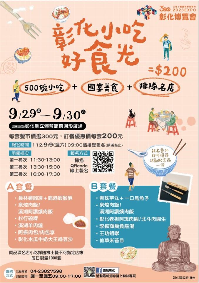 新聞焦點 「彰化小吃好食光」報名秒殺完售 感謝支持彰化地在美食 歷史訊息 | 發布日期 2023/09/09~2023/10/09 | 發佈單位: 城市暨觀光發展處 | 發佈日期: 李科長 7532761 | 更新日期 2023/09/09 | 瀏覽人數: 131人 為歡慶彰化建縣滿300週年,彰化縣政府特別規劃「彰化博覽會」系列活動,其中9月29日及9月30日各提供1千套的「彰化小吃好食光」,於今(9)日上午9時受理報名隨即秒殺,全數完售,縣府感謝大家的支持,也歡迎大家繼續支持彰化在地美食。 為展現彰化300年的飲食文化韻味,縣府用心規劃「彰化小吃好食光」,歡迎喜愛美食的朋友9月29日及9月30日來彰化盡情的大啖「美食」。「彰化小吃好食光」以2種套餐形式,網羅台灣版必比登500碗殊榮的彰化小吃,像是爌肉飯、肉圓、肉包、芋丸及碗粿,以及曾經登上國宴的王功蚵嗲等排隊美食,只要花200元且不用排隊就可吃遍彰化的知名小吃,9月9日上午9時開放報名訂餐,隨即秒殺完售。