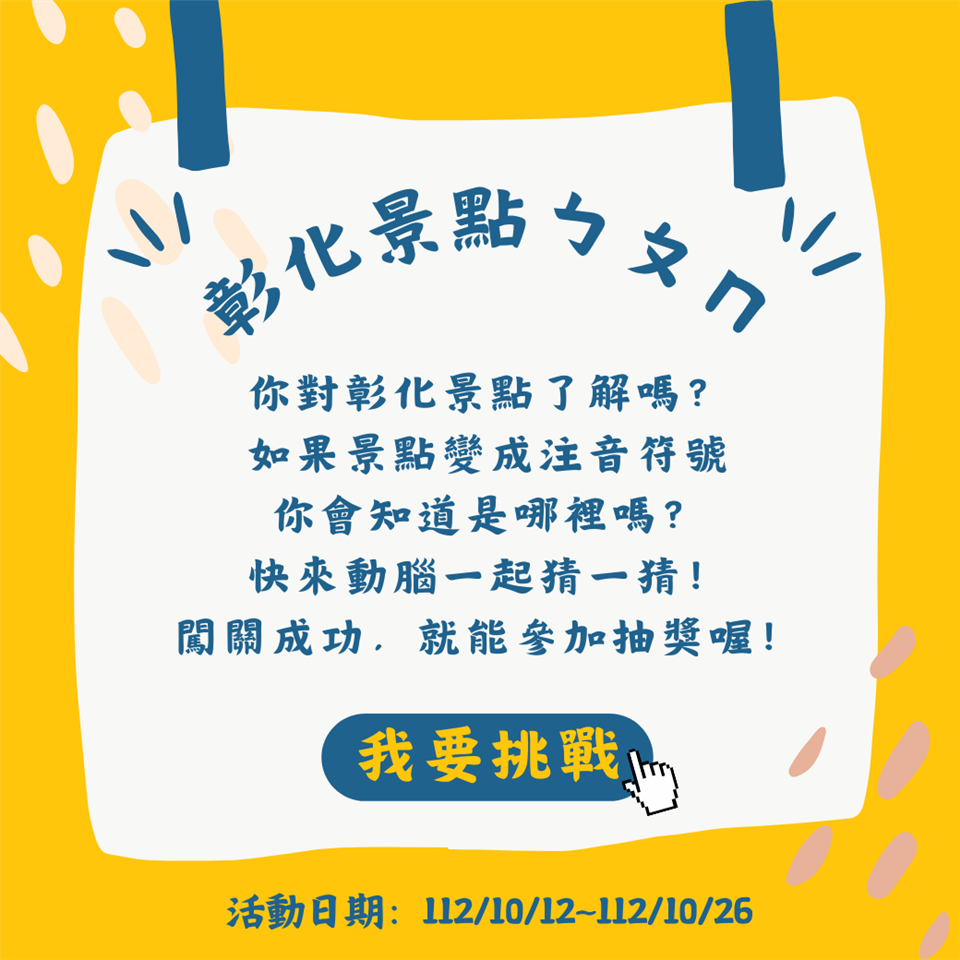 活動快訊 愛玩彰化LINE-彰化景點ㄅㄆㄇ等你來挑戰 歷史訊息 | 發布日期 2023/10/13~2023/11/13 | 發佈單位: 城市暨觀光發展處 | 發佈日期: 李科長 7532761分機2761 | 更新日期 2023/10/13 | 瀏覽人數: 128人 你對彰化景點了解嗎⁉️ 愛玩彰化LINE趣味小遊戲再出招!!!!! 「彰化景點ㄅㄆㄇ」共有三個關卡 等你來挑戰 📝活動辦法 1.即日起至10/26 2.加入愛玩彰化官方LINE( 點擊 https://lin.ee/pu74mFM 或搜尋ID:@playchanghua) 3.點開主選單上排「趣味小遊戲」藉由提示的ㄅㄆㄇ來猜猜彰化景點 4.答對者請用手機截圖「恭喜答對啦!」頁面上傳至本貼文下方留言,就有機會抽中「彰化豐采 榮耀三百」紙杯墊2個,預計抽出5位幸運得獎者!