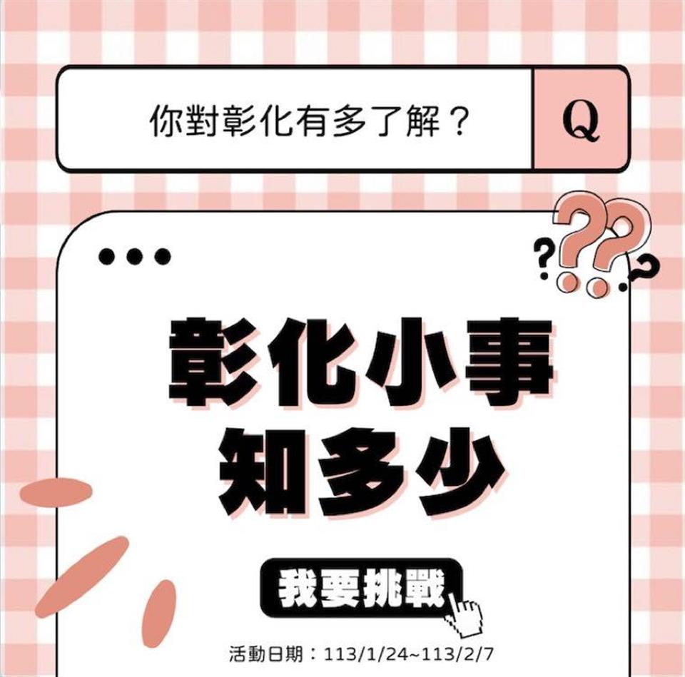 活動快訊 #彰化知識達人站出來 愛玩彰化LINE-彰化小事知多少大挑戰PART2 歷史訊息 | 發布日期 2024/01/30~2024/02/29 | 發佈單位: 城市暨觀光發展處 | 發佈日期: 李科長 7532761分機2761 | 更新日期 2024/01/30 | 瀏覽人數: 129人 #彰化知識達人站出來 愛玩彰化LINE-彰化小事知多少大挑戰PART2 共有三題 快點來挑戰吧!!! #活動辦法 1.即日起至2/7 2.加入愛玩彰化官方LINE( 點擊 https://lin.ee/pu74mFM 或搜尋ID:@playchanghua) 3.點開主選單上排「趣味小遊戲」來測驗看看你對彰化的了解程度 4.答對者請用手機截圖「恭喜獲得彰化知識王!稱號」頁面,並上傳至臉書貼文下方留言,就有機會抽中「卦山大縱走紀念毛巾」1個,預計抽出3位幸運得獎者,將優先抽出1個頭號粉絲哦!