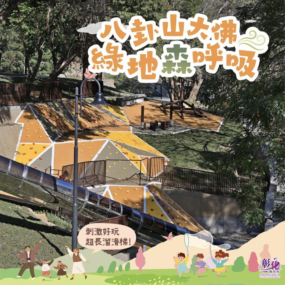 活動快訊 \ #戶外遊憩新景點 大佛綠地森呼吸🌲 / 八卦山風景區裡的超夯森林系樂園 #自然生態園區 即將啟用啦~🤩 歷史訊息 | 發布日期 2024/02/20~2024/03/20 | 發佈單位: 城市暨觀光發展處 | 發佈日期: 蔡科長 7532771分機2771 | 更新日期 2024/02/20 | 瀏覽人數: 121人 \ #戶外遊憩新景點 大佛綠地森呼吸🌲 / 溜滑梯溜到尖叫‼️小孩放電爸媽放鬆!! 加碼發放色違『親子多多龍』!!! 八卦山風景區裡的超夯森林系樂園 #自然生態園區 即將啟用啦~🤩 大片草地、高聳樹木, 可以盡情玩耍、森呼吸! 超高人氣、超長溜滑梯, 讓你一路溜到底, 尖叫聲不斷! 親子遊憩區玩攀岩牆、攀爬網,散步夕霧花園、邀月池、交誼廣場及幽谷綠園…等園區,讓你意猶未盡!! 🌲啟用儀式🌲 活動時間: 113/02/28 (三) 10:00 活動地點: 自然生態園區 圓形廣場 📍https://maps.app.goo.gl/pmYaxt82dijCAJkM7 🌲活動當天 #加碼發放🌲 色違『親子多多龍』小提燈 <限量1000份> 09:30 發放號碼牌 10:30 憑號碼牌領取 _ #彰化 #八卦山 #大佛 #綠地 #森呼吸 #溜滑梯 #親子 #遊樂 #景點