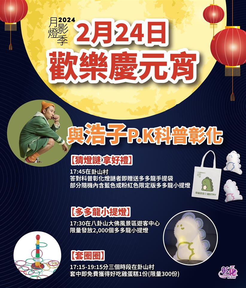 新聞焦點 浩子下戰帖 歡迎來PK 「2024彰化月影燈季」歡樂慶元宵特別活動 歷史訊息 | 發布日期 2024/02/21~2024/03/21 | 發佈單位: 城市暨觀光發展處 | 發佈日期: 城觀處 7222151 | 更新日期 2024/02/21 | 瀏覽人數: 126人 你知道彰化有多少隱形冠軍?彰化產雞蛋最多在哪一鄉鎮?如果你也是彰化通,歡迎元宵節晚上來與浩子PK,科普彰化! 彰化縣政府辦理「2024彰化月影燈季」活動,於去年12月30開燈,迄2月18日已吸引超過157萬遊客參觀,在燈季尾聲,彰化縣政府繼1月20日「歡樂放寒假」、2月14日「浪漫情人節」,系列活動三-歡樂慶元宵,將於2月24日元宵節晚間於八卦山大佛風景區-卦山村舉辦,下午17:30開始於八卦山大佛風景區旅客服務中心發放超高人氣多多龍小提燈限量2000個,17:45開始猜燈謎活動,彰化出生藝人浩子,與你一起同樂猜燈謎,科普彰化!共有80個題目,答對者即贈送限量多多龍手提袋,其中有機會得到王惠美縣長特別加碼的藍色或粉紅色限定版多多龍小提燈;現場還有趣味套圈圈遊戲,套中即免費獲得好吃雞蛋糕1份,歡迎大小朋友一起來歡樂慶元宵,挑戰彰化通。 彰化縣政府表示:「2024彰化月影燈季」及「員林燈會」活動將於3月3日熄燈,還有在溪州公園的「2024花在彰化」活動至2月25日,還沒參加集章抽大獎的民眾,請把握機會。只要於三活動地點以LINE掃描任兩處指定QRcode,即有機會獲得iphone15、ipad等好禮,及特別加碼的500個粉紅限定版多多龍小提燈,相關訊息請上「愛玩彰化」臉書及月影燈季活動網頁(https://www.2024ch.com.tw/)查詢。