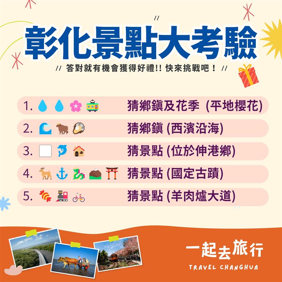 活動快訊 彰化熱門景點大考驗! 答對就有機會獲得好禮🎁 #快來挑戰吧! 歷史訊息 | 發布日期 2024/04/23~2024/05/23 | 發佈單位: 城市暨觀光發展處 | 發佈日期: 李科長 7532761分機2761 | 更新日期 2024/04/23 | 瀏覽人數: 157人 彰化熱門景點大考驗! 答對就有機會獲得好禮🎁 #快來挑戰吧! 你是彰化景點通嗎⁉️ 下方彰化知名景點,你能猜出幾個❓ 題目1 | 💧💧🌸🚃 猜鄉鎮與花季 (平地櫻花) 題目2 | 🌊🐂🦪 猜鄉鎮 (西濱沿海) 題目3 | ⬜️🐬🏚️ 猜景點 (位於伸港鄉) 題目4 | 🦌⚓🐉⛰️⛩️ 猜景點 (國定古蹟) 題目5 | 🍬🚂🚲 猜景點 (羊肉爐大道) <✍️作答區> https://forms.gle/fw6yxeT68WPjBNjz6 【#活動辦法】 只要於2024/4/28前,於作答區完成作答並完成下方步驟就有機會獲得超值好禮!! 1.按讚追蹤「愛玩彰化」粉絲專頁並轉發本篇活動貼文 2.上傳完成作答圖截圖至活動貼文留言處,@ 3位好友 邀請他們一起來挑戰! 🎁星巴克飲品券2張 (共10組) 參與本次活動者即可參予抽獎 *保留3組予頭號粉絲* _ 彰化旅遊 #熱門景點 #打卡熱點 #抽獎活動