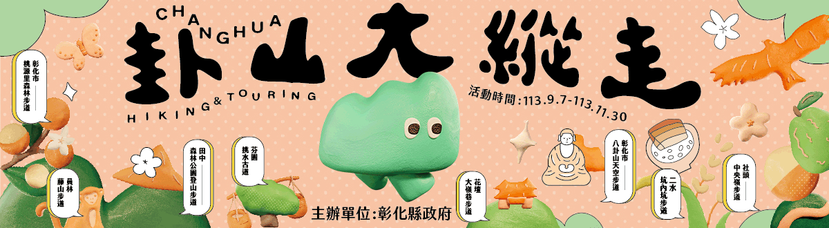 活動快訊 2024卦山大縱走 · 彰化兜兜圈 完登步道抽好禮 歷史訊息 | 發布日期 2024/09/03~2024/11/30 | 發佈單位: 城市暨觀光發展處行銷推廣科 | 發佈日期: 丁科長 7532781分機2781 | 更新日期 2024/09/03 | 瀏覽人數: 178人 2024卦山大縱走 · 彰化兜兜圈 完登步道抽好禮 小山怪邀你來挑戰,征服8條登山步道、享受彰化美食之旅 ⠀⠀⠀⠀⠀⠀⠀⠀⠀⠀⠀⠀ #活動時間 | 2024/09/07 至 2024/11/30止 #活動地點 | 北起彰化市天空步道、桃源里登山步道、花壇大嶺巷步道、芬園挑水古道、員林市藤山步道,社頭中央嶺及十八彎古道、田中森林公園步道,南至二水鄉坑內坑步道。 #活動官網 | https://baguashan2024.mystrikingly.com/ ⠀⠀⠀⠀⠀⠀⠀⠀⠀⠀⠀⠀ 活動三部曲 | #登山健行抽好禮|參加8條步道健行活動,即可透過「愛玩彰化官方LINE」參與 #數位集章,走完4條有1次抽獎機會、走完8條有2次抽獎機會,獎品包括iPad Air、Apple Watch、50吋電視等;每完登一條步道,就享有37家 #特約店家優惠 或滿額贈禮 ⠀⠀⠀⠀⠀⠀⠀⠀⠀⠀⠀⠀ #健走美食之旅|10/12在八卦山天空步道結合「彰化焢肉飯節-大胃王比賽」活動,報名並完登步道者,即可免費兌換爌肉飯 ⠀⠀⠀⠀⠀⠀⠀⠀⠀⠀⠀⠀ #千人齊步走|活動期間參與8條步道小旅行,每條路線完成2枚數位集章,就能兌換最萌小山怪的 #完登禮;10/5在社頭清水岩寺的主場活動,還可領取限定的 #物資包,現場更有摸彩、特色市集,等你來玩! 報名網址 | https://lin.ee/Foe6htE ⠀⠀⠀⠀⠀⠀⠀⠀⠀⠀⠀⠀ 快來報名參加讓小山怪為你帶路,一起到彰化 HIKING & YOURING ,來趟大自然的健行之旅,走完步道再到彰化各鄉鎮兜兜圈,享受美食與景點,留下深刻的旅行回憶!