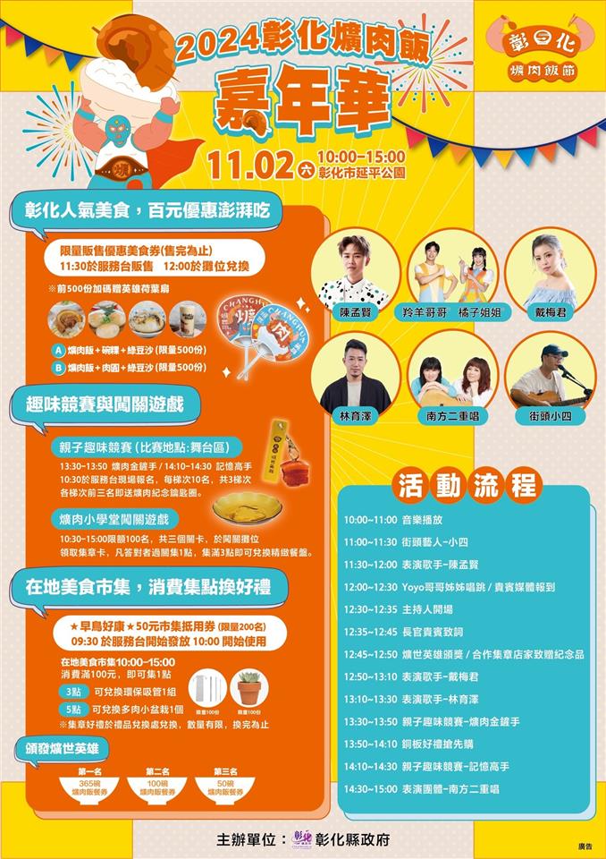 活動快訊 🎉#2024彰化爌肉飯嘉年華 即將登場🍖 歷史訊息 | 發布日期 2024/10/30~2024/11/30 | 發佈單位: 城市暨觀光發展處行銷推廣科 | 發佈日期: 丁科長 7532781分機2781 | 更新日期 2024/10/30 | 瀏覽人數: 175人 𝟭𝟭/𝟬𝟮 歡迎到彰化市延平公園參加爌肉飯嘉年華,一起享受美食與娛樂的爌世盛宴! #彰化人氣美食 100元優惠澎湃吃🥢 🅰️餐|爌肉飯+碗粿+綠豆沙,限量500份 🅱️餐|爌肉飯+肉圓+綠豆沙,限量500份 🌟前500份加碼贈送 #爌世英雄扇子🌟 ※活動現場限量販售優惠美食券(售完為止) 🎯趣味競賽✘闖關遊戲:親子趣味競賽、爌肉小學堂闖關遊戲 🛒特色市集:50攤特色攤位,在市集消費即可集點換好禮哦! 🎤精彩表演:Yoyo家族帶動跳、林育澤、戴梅君、南方二重唱等現場演出 當天還會揭曉萬眾期待的 #爌世英雄得主,將頒發一年份365碗爌肉飯餐券👏 ❱❱❱ 豐富活動等你來玩,這場年度盛宴,缺你不可! #2024彰化爌肉飯嘉年華 時間|𝟭𝟭月𝟮日 𝟭𝟬:𝟬𝟬-𝟭𝟱:𝟬𝟬 地點|彰化市延平公園 活動資訊詳官網連結 #彰化爌肉飯節 #爌世英雄 #彰化美食 #數位集章 #爌肉飯嘉年華
