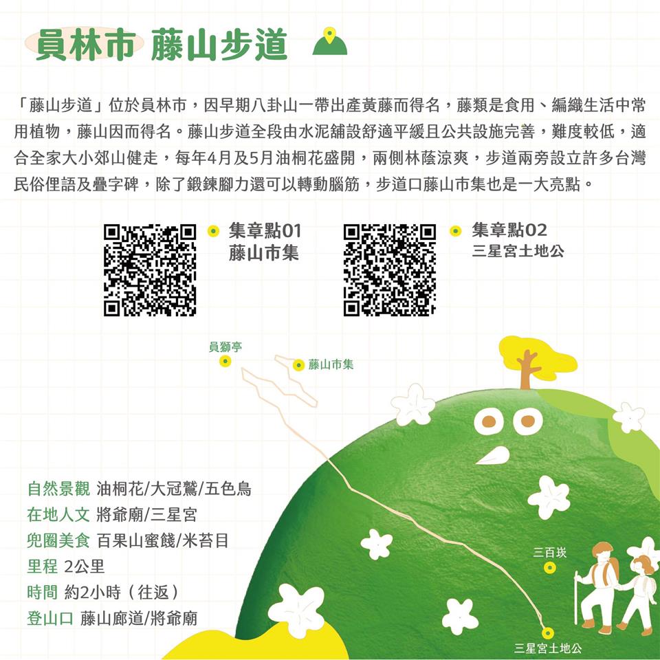 活動快訊 ►2024卦山大縱走ᴘᴀʀᴛ. 6 · 員林藤山步道◄ 歷史訊息 | 發布日期 2024/10/24~2024/11/30 | 發佈單位: 城市暨觀光發展處行銷推廣科 | 發佈日期: 丁科長 7532781分機2781 | 更新日期 2024/10/30 | 瀏覽人數: 167人 ►2024卦山大縱走ᴘᴀʀᴛ. 6 · 員林藤山步道◄ #完登步道抽好禮 #健康起步走 📣風和日麗的好天氣,週末一起到彰化兜兜圈🌞 🌳#員林藤山步道|因早期盛產黃藤而得名,路面寬敞且坡度平緩,為親民舒適的步道。沿途設置許多觀景台可以休憩,也可以在 #員獅亭眺望員林市景。每年春夏之際,雪白的 #油桐花 遍布山谷,宛若落雪美景,總是吸引眾多遊客慕名前來。 步道兩旁設有趣味的 #台灣民俗俚語 及疊字碑,讓遊客除了鍛鍊腳力,還可以轉動腦筋、輕鬆認識台語文化,相當適合親子同遊。 登山健走完,別忘了到員林市區品嘗米糕、米苔目等在地美食,一起共度悠閒愉快的週末時光❤️👣 ⏰活動時間:113年10月26日 星期六 07:30-11:00 🔸上網完成報名,於活動日順利完登,集滿該步道2枚集章,當天即可於服務台兌換 #完登禮 🔸透過「愛玩彰化官方LINE」參與 #數位集章,完登4條以上步道就有機會抽中好禮,還能到37家 #特約店家享優惠 ⛰️ 里程 | 約2公里 時間 | 約2小時 在地人文 | 員林興賢書院 兜圈美食 | 八寶冰、百果山蜜餞、米苔目、米糕、雞腳凍 活動官網詳連結 📸感謝IG網友 @jiangjiang_food、抹茶小姐&生魚片先生 提供照片授權