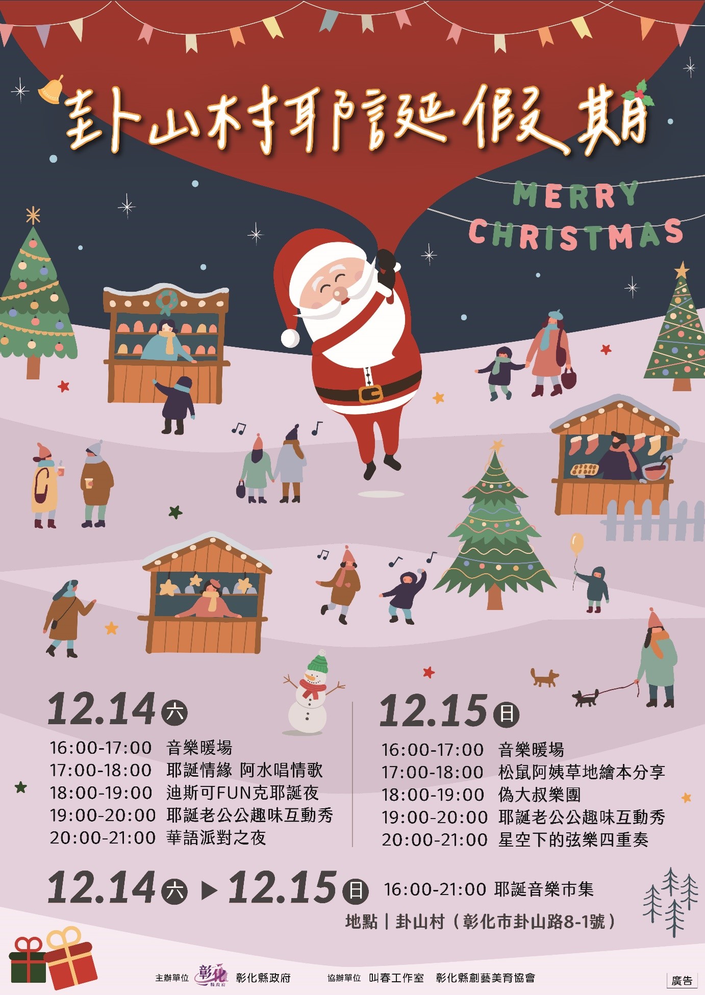 活動快訊 2024卦山村耶誕假期 12/14~12/15熱鬧歡慶聖誕,邀您共度浪漫週末 歷史訊息 | 發布日期 2024/12/07~2024/12/15 | 發佈單位: 城市暨觀光發展處行銷推廣科 | 發佈日期: 邱品鈜 047532782分機2782 | 更新日期 2024/12/06 | 瀏覽人數: 163人 為迎接聖誕節的到來,彰化縣政府將於12月14日(星期六)至12月15日(星期日)舉辦「2024卦山村耶誕假期」,邀請民眾一同歡慶聖誕。活動每日下午16:00至21:00在卦山村熱鬧登場,現場將變身為充滿濃濃聖誕氛圍的歡樂天地,與您共度浪漫週末。 現場有精彩的表演,包括街頭藝人表演(阿水)、DJ秀,還有偽大叔樂團帶來的流行金曲,以及弦樂四重奏演奏的聖誕主題樂曲,每一場表演都將帶領您沉浸於節日的美妙氛圍,感受聖誕的歡樂與浪漫。此外,現場還有卦山村店家及彰化在地商家組成的耶誕市集,提供熱紅酒、麻辣燙、啤酒、手作甜點、咖啡等美食,還有各式各樣的手作商品,讓您在聖誕氛圍中盡情享受購物與美食的樂趣。 活動現場,也特別為小朋友安排了聖誕繪本故事時間,由松鼠阿姨為孩子們講述溫馨的聖誕故事,讓孩子們在歡樂的故事中感受聖誕的魔力。聖誕老公公也將現身活動現場,與大家趣味互動,送上溫暖的聖誕祝福,與大小朋友合影留念,讓整個活動更加充滿節日的歡樂氣氛。 「2024卦山村耶誕假期」不僅是一場音樂表演的盛會,更是與家人共度愉快聖誕的最佳場所。不論是享受熱鬧市集、音樂表演,還是聖誕故事時間,這裡都將為您帶來難忘的聖誕回憶,邀請大朋友小朋友搭乘18路公車一同來體驗這場獨特的節日盛宴。 縣府持續帶來一系列精彩的活動,歡迎大家到彰化旅遊,12月21日晚上在彰化員林市圓林園滯洪生態公園舉辦「2024彰化歲末演唱會」,還有即將登場「2025花在彰化」以及「2025彰化月影燈季」精彩可期,相關活動資訊請上彰化縣政府全球資訊網查詢,彰化愈來愈精彩,請大家拭目以待。