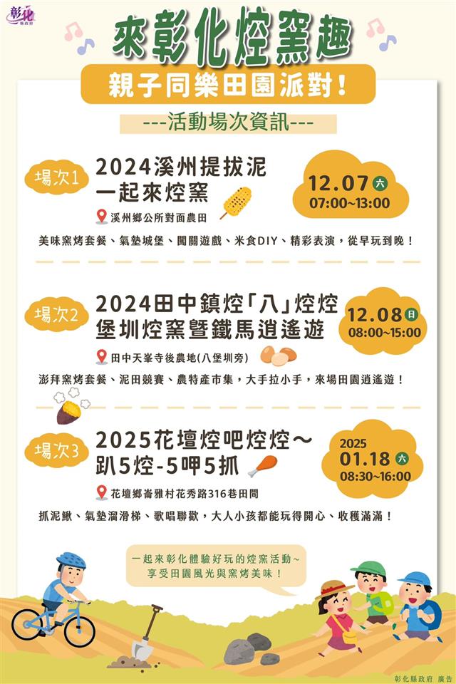 活動快訊 來彰化焢窯趣,親子同樂田園派對 歷史訊息 | 發布日期 2024/12/06~2025/01/06 | 發佈單位: 城市暨觀光發展處行銷推廣科 | 發佈日期: 丁科長 7532781分機2781 | 更新日期 2024/12/06 | 瀏覽人數: 147人 田野進入休耕季,空曠的農田搖身一變,小孩和大人最期待的 #焢窯派對 就此展開🔥 冬天最暖心的親子活動非焢窯莫屬! 從堆窯、撿柴、燒窯、悶窯到開窯,一起動手搭窯、享受田園風光與窯烤美味,來彰化體驗好玩的焢窯活動,共度美好時光💛 ꙳ ꕀ꙳ ꕀ꙳ ꕀ꙳ ꙳ ꕀ꙳ ꕀ꙳ ꕀ꙳ ꕀ꙳ ⭐【活動場次資訊】⭐ 場次1️⃣:#2024溪州提拔泥 一起來焢窯 日期:𝟭𝟮/𝟳 (六) 𝟬𝟳:𝟬𝟬-𝟭𝟯:𝟬𝟬 地點:溪州鄉公所對面農田 ✦歡迎來溪州享受道地的焢窯樂趣! ⤿活動現場有雞腿、雞翅、番薯、玉米等美味窯烤套餐,還有氣墊城堡、闖關遊戲,以及有趣的米食DIY手作體驗,精彩的舞蹈和樂團表演,讓你從早玩到晚! 👉活動資訊:https://reurl.cc/V0EDeN 場次2️⃣:2024田中鎮焢「八」焢焢 #堡圳焢窯暨鐵馬逍遙遊 日期: 𝟭𝟮/𝟴 (日) 𝟬𝟴:𝟬𝟬-𝟭𝟱:𝟬𝟬 地點:田中天峯寺後農地(八堡圳旁) ✦大手拉小手,來場田園逍遙遊! ⤿土窯雞、魚、地瓜、玉米、馬鈴薯等澎拜窯烤套餐,當天還有騎鐵馬、泥田競賽、農特產市集與舞台表演等豐富活動,吃喝玩樂暢遊田中! 👉活動資訊:https://reurl.cc/RL0XXD 場次3️⃣:#2025花壇焢吧焢焢~趴5焢-5呷5抓 日期:𝟮𝟬𝟮𝟱/𝟭/𝟭𝟴 (六) 𝟬𝟴:𝟯𝟬-𝟭𝟲:𝟬𝟬 地點:花壇鄉崙雅村花秀路316巷田間 ✦愛呷、愛玩的你,快來花壇開趴吧! ⤿窯烤套餐包含雞腿、玉米、地瓜、雞蛋,現場還準備了豐富的DIY體驗、抓泥鰍、氣墊溜滑梯等親子活動。更有歌唱聯歡、熱鬧市集,大人小孩都能玩得開心、收穫滿滿! 👉 活動詳情請鎖定 彰化縣花壇鄉公所 臉書專頁 ꙳ ꕀ꙳ ꕀ꙳ ꕀ꙳ ꙳ ꕀ꙳ ꕀ꙳ ꕀ꙳ ꕀ꙳ #溪州 #田中 #花壇 #焢窯 #彰化旅遊 #親子同樂