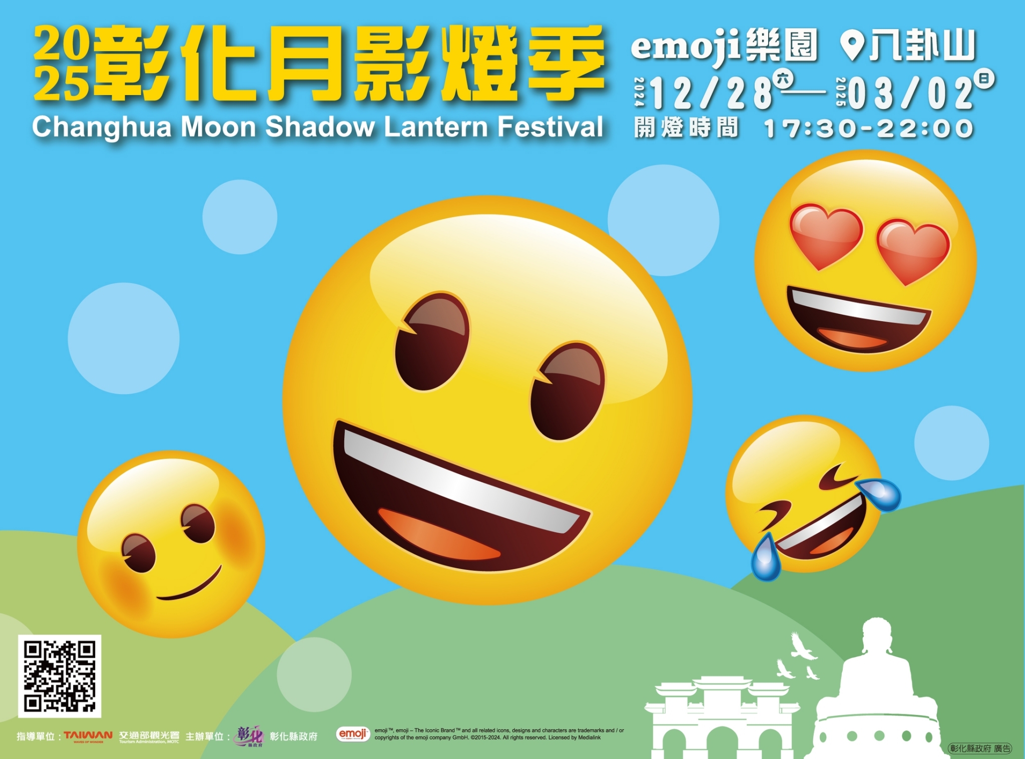活動快訊 2025彰化月影燈季-emoji樂園,113年12月28日登場 歷史訊息 | 發布日期 2024/12/14~2025/03/02 | 發佈單位: 城市暨觀光發展處行銷推廣科 | 發佈日期: 丁科長 7532781 | 更新日期 2024/12/10 | 瀏覽人數: 146人 「2025彰化月影燈季」將於113年12月28日隆重開燈,展出至明年3月2日止,每天晚上5點30分至10點,璀璨閃亮燈光加上各種可愛emoji裝置及燈光秀,陪大家歡樂迎接新的一年。 今年月影燈季與手機社群、通訊軟體都會用到、看到的emoji表情符號合作,整個燈區佈滿可愛多樣的表情符號,結合各種燈光,將八卦山大佛風景區打造成歡樂、可愛的「emoji樂園」,還有以大佛及夜空為背景的精彩燈光秀,及巨型emoji裝置、搭配美國emoji電影授權原聲歌曲及各種emoji表情變化,要給大家不同以往的可愛、熱鬧氛圍。