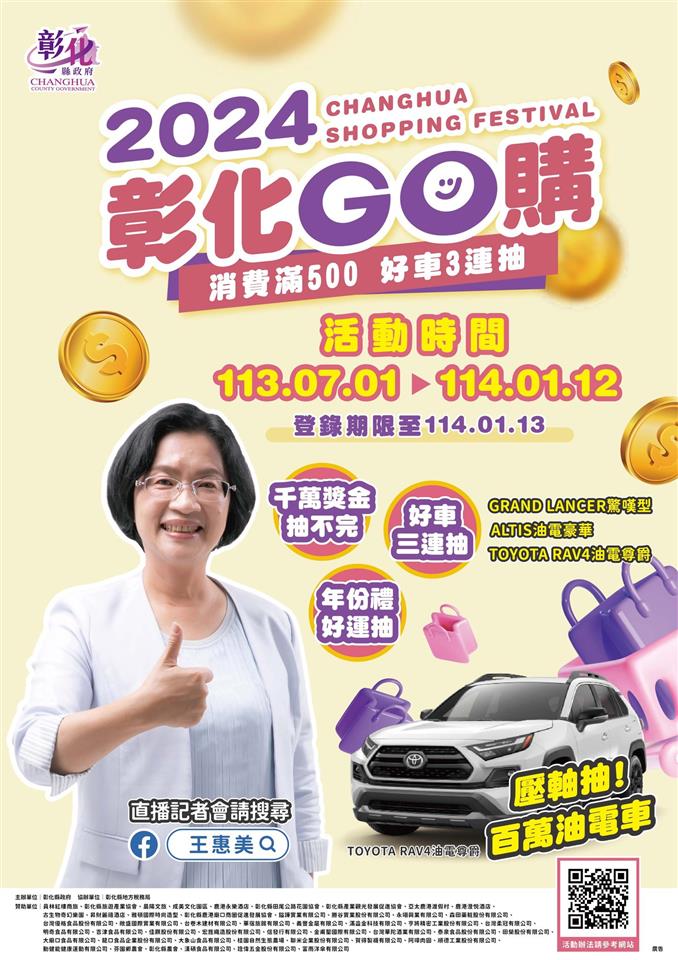 新聞焦點 「2024彰化歲末演唱會」12/21圓林園即將登場 玖壹壹、八三夭接連開唱 12/28彰化月影燈季開燈 歷史訊息 | 發布日期 2024/12/17~2025/01/17 | 發佈單位: 城市暨觀光發展處 | 發佈日期: 丁科長 047532781 | 更新日期 2024/12/17 | 瀏覽人數: 157人 「2024彰化歲末演唱會」將於12月21日(本周六)在員林圓林園生態公園歡樂登場,彰化縣政府邀請超強藝人組合演唱,包括近期剛辦完售票演唱兩組重量級天團,八三夭及玖壹壹,情歌王子陳勢安、林隆璇,台語金曲歌王.歌后施文彬、秀蘭瑪雅以及孟慶而、P!SCO樂團等卡司,匯集8組老中青國台語等實力歌手輪番獻唱!活動節目精彩,歲末演唱會當天也會發放免費限量3,000份湯圓,搭配美食市集,一系列精采活動接連登場,彰化縣長王惠美在歲末時節感恩過去一年大家的努力與付出,也要跟大家一起迎接嶄新的2025年。 王縣長表示,今年活動不只是演唱會,還有美食市集、480秒煙火秀,還有摸彩抽大獎等等,當天只要憑11-12月消費200元紙本發票2張,即可兌換摸彩劵乙張,獎品包括縣府提供的機車、65吋液晶電視、洗衣機及冰箱,此外員林市公所再加碼iPhone16、Dyson吹風機、Garmin手錶、咖啡機、50吋電視等,希望讓大家看得過癮、吃得開心,還有機會把大獎帶回家。另外,「彰化GO購」活動將在明年1月15日最後一次抽獎,只要在彰化消費滿500元,登錄發票或收據就有機會抽中百萬汽車及多項大獎,配合歲末演唱會,活動當天在員林市消費滿額,還會多一組抽獎序號,增加中獎機會,買越多,中獎越多。 王縣長指出,除了歲末演唱會之外,縣立美術館前廣場有「聖誕點燈」;另外,接續登場的還有「2025彰化月影燈季」,將於12月28日開燈,一直展出至114年3月2日,開燈當天也會發送限量2,000個小提燈,整個八卦山將化身成emoji樂園,也有精彩燈光秀演出,每逢星期五更有特別版燈光秀。 相關活動資訊請全國鄉親上彰化縣政府 全球資訊網查詢。
