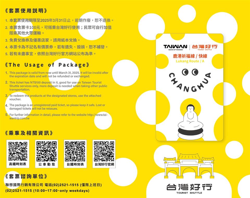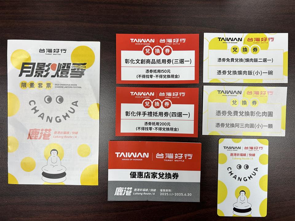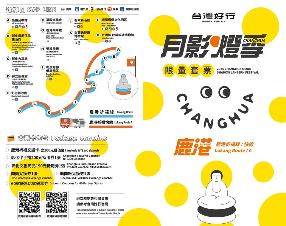 新聞焦點 台灣好行鹿港祈福線超值限定套票半價優惠開跑囉! 歷史訊息 | 發布日期 2025/01/24~2025/03/31 | 發佈單位: 城市暨觀光發展處企劃發展科 | 發佈日期: 李科長 7532761 | 更新日期 2025/01/22 | 瀏覽人數: 137人 台灣好行鹿港祈福線特別推出限量「月影燈季限定優惠套票」,從高鐵台中站出發,行經彰化市至鹿港鎮,民眾可搭乘好行輕鬆體驗月影燈季活動,品嘗彰化市特色美食小吃以及暢遊鹿港老街、觀光工廠等,不論歲末年終闔家出遊或是農曆春節走春祈福,搭乘大眾運輸免去停車及塞車煩惱,輕鬆自在又可享受超值優惠! 「月影燈季限定優惠套票」包含一卡通特別版交通卡(含百元儲值金)、彰化伴手禮200元抵用劵、彰化文創商品150元抵用券以及好行沿線60家合作店家專屬優惠劵,還特別贈送彰化市知名肉圓及爌肉飯兌換券各一張,總價值超過650元,現在優惠價只要300元,半價超值好康限量300份,即日起在易遊網及太陽網販售,數量有限請把握機會! 2025彰化月影燈季特別以「emoji樂園」為主題,搭配音樂律動及emoji表情變化並以夜空為背景,呈現多彩的閃耀光束,帶來不同以往的視覺饗宴及可愛熱鬧氛圍,除了台灣好行之外,彰化縣政府還特別為彰化大佛風景區的「18路公車」換裝,與民眾一同歡樂迎接新年。 歡迎民眾多加利用大眾運輸前來賞燈季、遊彰化、過新年!