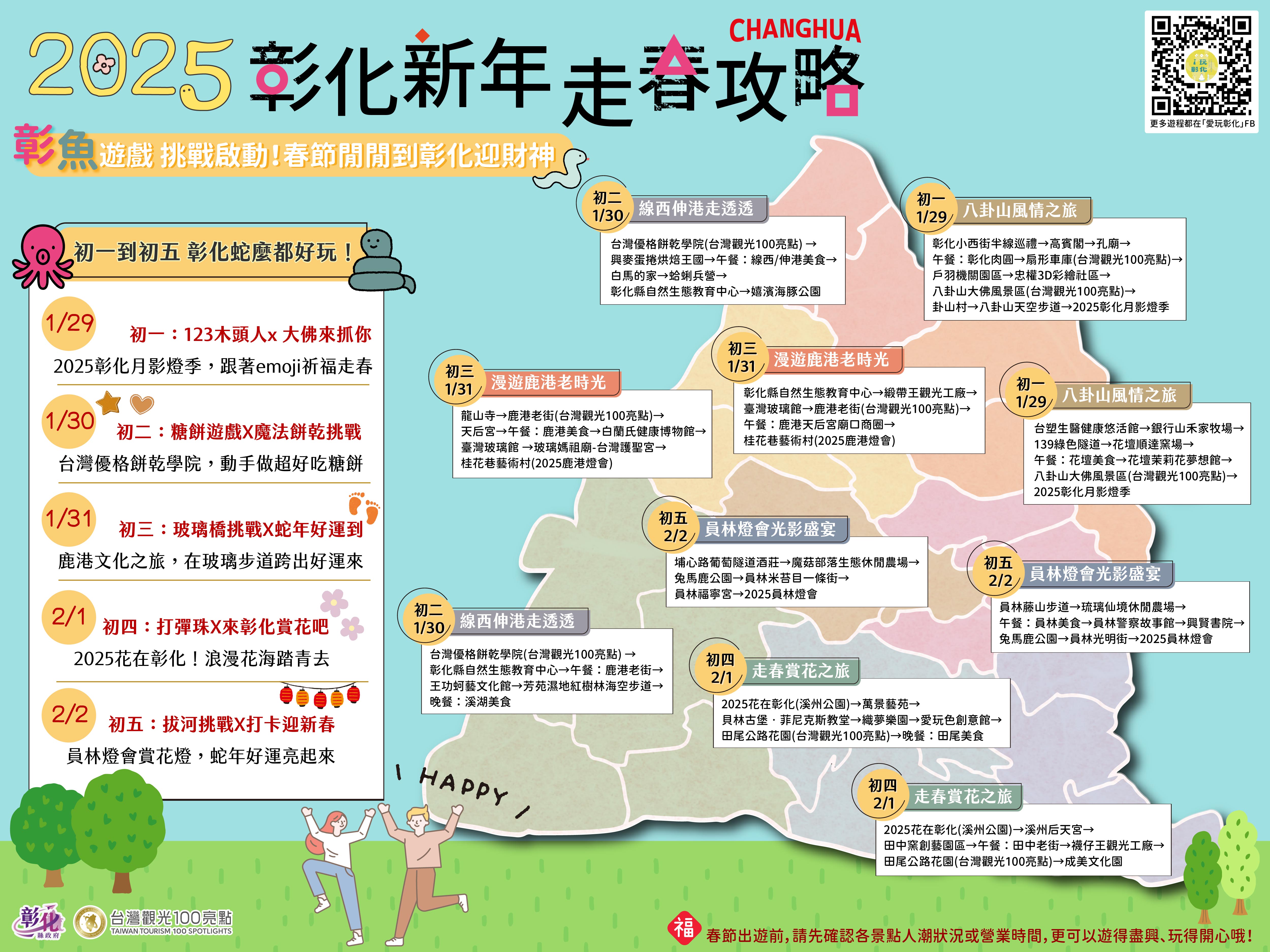 新聞焦點 2025走春攻略新玩法!彰化《彰魚遊戲》讓蛇年春節超好玩 歷史訊息 | 發布日期 2025/01/25~2025/02/24 | 發佈單位: 城市暨觀光發展處企劃發展科 | 發佈日期: 李科長 7532761 | 更新日期 2025/01/24 | 瀏覽人數: 117人 2025春節假期即將來臨,想好去哪裡玩了嗎?快來參考彰化縣政府推出的「2025彰化新年走春攻略」,攻略內容參考知名影集魷魚遊戲關卡內容元素,結合彰化入選交通部觀光署的「台灣觀光100亮點」景點,創意發想初一到初五走春輕旅行「彰魚遊戲」,讓民眾在春節期間跟著「彰魚遊戲」的腳步,來彰化蛇來蛇去,彰化縣長王惠美歡迎大家來彰化走春,感受不一樣的走春樂趣,並在旅程中祈求蛇年的好運! 城觀處表示,此次走春攻略從大年初一持續到初五,安排了多條主題路線,初一可以到八卦山大佛風景區挑戰「123木頭人」的趣味遊戲,並結合2025彰化月影燈季的emoji祈福互動,為新年開啟平安祥和的序幕。初二邀請民眾到台灣優格餅乾學院,在糖餅手作中體驗甜蜜新年氛圍。初三來人氣最高、旅客數奪冠的全台最強老街「鹿港老街」走走,探訪台灣玻璃館,參觀玻璃媽祖廟走訪黃金隧道玻璃橋,以透明之旅迎接蛇年好運。 初四推薦民眾來到溪州公園「2025花在彰化」,賞花走春挑戰尋找類「彈珠」小物,如花蕾、果實等,讓民眾在浪漫花海中拍下美麗回憶並重溫童年樂趣。初五至員林燈會,找到主燈擺出奮力拔河的對決姿勢,一起創意打卡迎新春,員林公園燈會現場充滿年節氛圍,適合全家共享歡樂時光。 2025年新春,彰化縣政府邀請民眾走春天天來彰化,來彰化挑戰「彰魚遊戲」,體驗別具創意的走春活動,讓新的一年「蛇」麼都好玩,幸福滿滿!請持續關注愛玩彰化臉書粉絲專頁及彰化旅遊資訊網https://tourism.chcg.gov.tw/ ,隨時掌握最新旅遊動態與活動資訊!