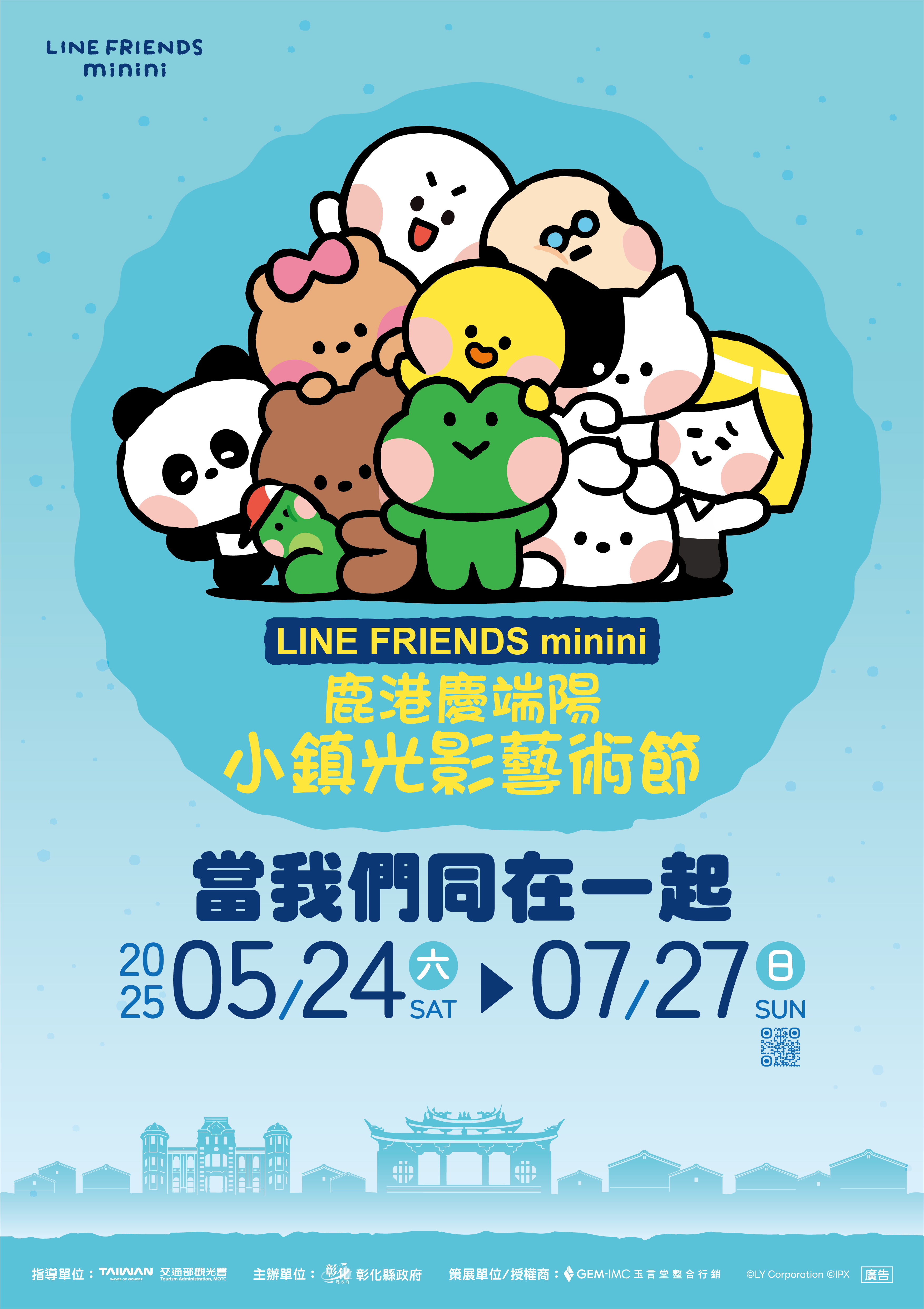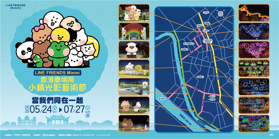 活動快訊 「2025鹿港慶端陽-小鎮光影藝術節」LINE FRIENDS minini 當我們同在一起 歷史訊息 | 發布日期 2025/05/22~2025/07/27 | 發佈單位: 城市暨觀光發展處行銷推廣科 | 發佈日期: 丁科長 分機2781 | 更新日期 2025/05/14 | 瀏覽人數: 34人 「2025鹿港慶端陽-小鎮光影藝術節」「LINE FRIENDS minini」當我們同在一起,將於114年5月24日點燈,一直展出至7月27日,每晚6:30-10:00亮燈,超級可愛的LINE FRIENDS minini來鹿港了,邀請全國民眾端午佳節、暑假期間,來彰化旅遊,與minini同遊經典小鎮鹿港。