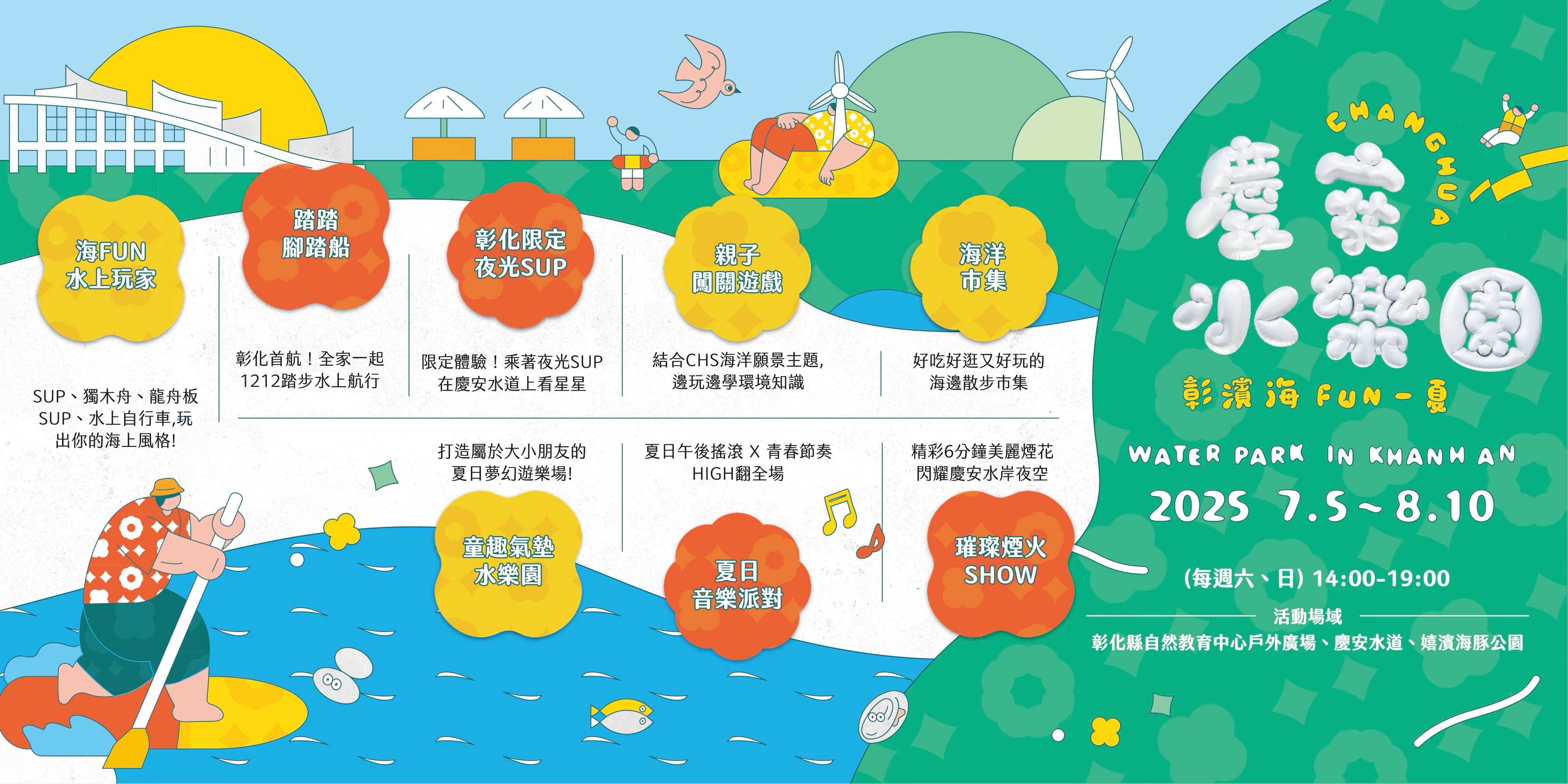 活動快訊 彰化最潮夏日活動回歸 慶安水樂園7月5日啟動,報名即刻開跑 歷史訊息 | 發布日期 2025/06/09~2025/07/09 | 發佈單位: 城市暨觀光發展處行銷推廣科 | 發佈日期: 陳巧婷 7532778分機2778 | 更新日期 2025/06/09 | 瀏覽人數: 41人 2025 #慶安水樂園 線上報名6/10開跑! 每年夏天最強檔活動 #彰濱海FUN一夏 回來啦! 無論你是初學者還是水上活動愛好者,這裡都有適合你的挑戰,讓最好玩又消暑的水樂園,陪你一起FUN暑假! 1活動檔期:7/5(六)~8/10(日) 每週六日 14:00–19:00 2活動地點:彰化縣自然教育中心戶外廣場、慶安水道、嬉濱海豚公園 3活動報名:https://reurl.cc/EV5pjn 6/10(二) 9:00 起開放線上報名 活動費用|每人150元(包含 50元市集抵用券、專業教練、體驗裝備、活動保險) 凡參加水上活動者即贈送 #限量涼感運動毛巾 活動亮點搶先看 7/5(六)開幕日 #音樂夏日派對 x #6分鐘煙火SHOW,當天穿上 #花襯衫 還可以兌換 #限量游泳圈杯座 水上體驗升級:SUP、獨木舟、水上自行車、龍舟板,再加碼全新 #遮陽腳踏船 夜光SUP & 夜間獨木舟首登場!浪漫航行看 #白色海豚屋夜景✨ 親子氣墊樂園 x 海洋闖關活動 x 文創&美食市集,讓大小朋友從白天嗨到晚上! 彰化縣自然生態教育中心 7/5(六)營業時間9:00-20:00,其餘六、日營業時間9:00-19:00 炎炎夏日帶著家人朋友一起來沁涼一夏吧