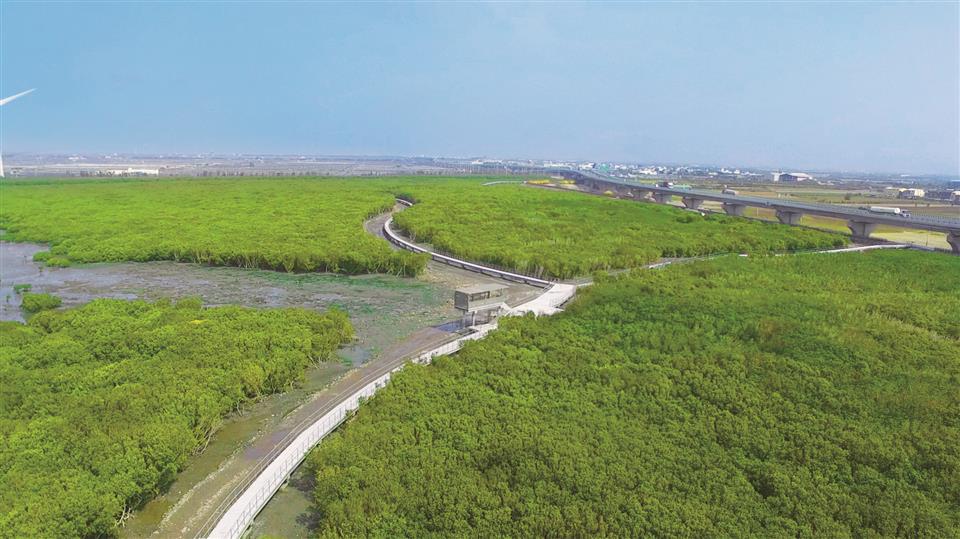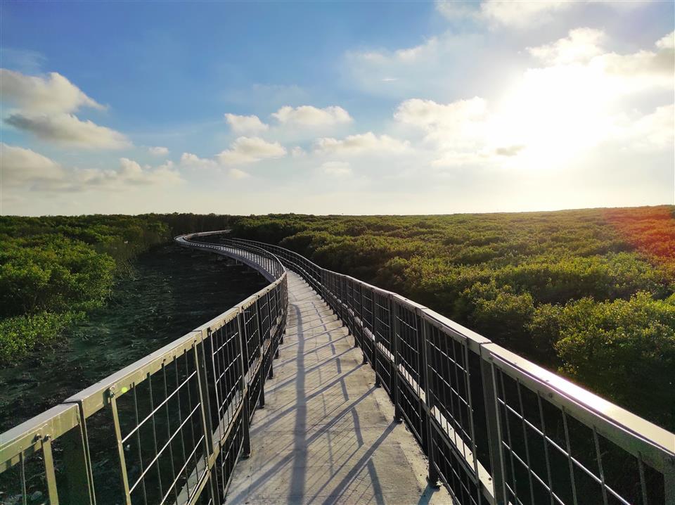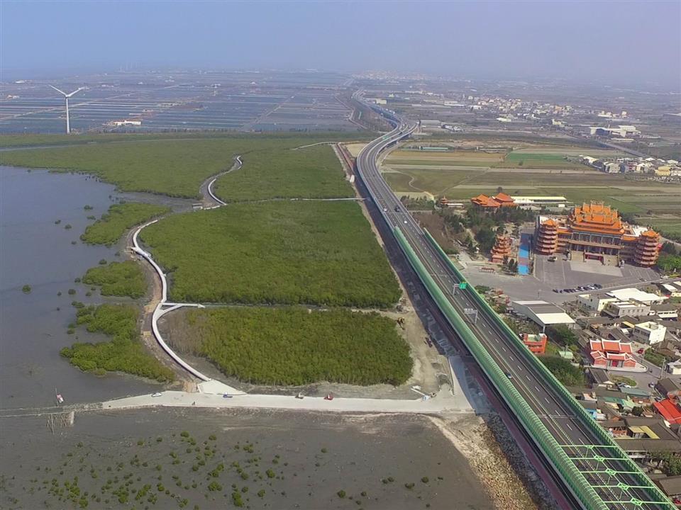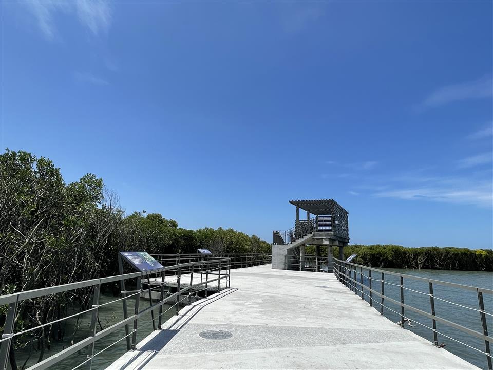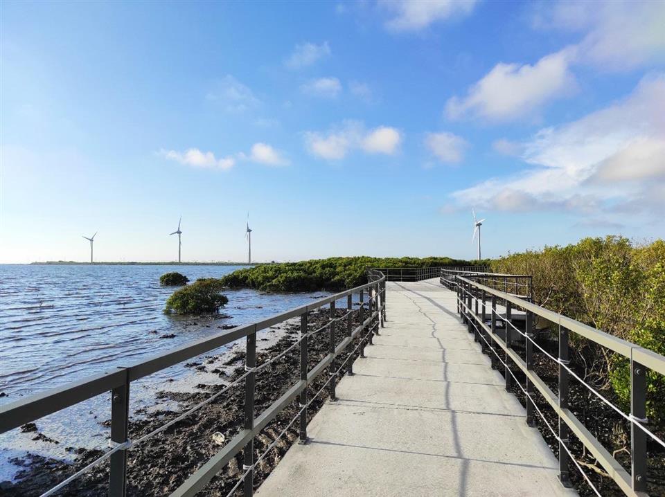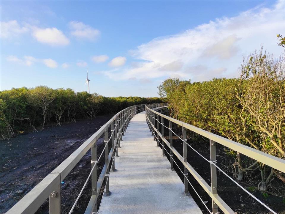 芳苑溼地紅樹林海空步道(芳苑濕地紅樹林暨其週邊整體環境改善)(110.09) 瀏覽人數: 500人 計畫緣起 芳苑濕地紅樹林當年係為穩定保固海堤而引入種植,目前海堤往外大部分範圍劃設為保安林地,且為鷺科繁殖棲息場所之一,經本府103年調查研究,適當疏伐處理可有效增進河口海岸棲地多樣性及生物多樣性,並做為濕地環境教育區之運用,因此本案在不影響保安林地狀況下,設置海空步道,同時在施工期間沿步道位置伐除寬6~8M紅樹林,清除根系後,讓底棲生物能有更多棲息空間,也讓鳥類覓食範圍增加,增添食物鏈的完整性,以增加生態多樣性。施工期程開工:108年11月4日 完工:110年5月12日芳苑溼地紅樹林海空步道 可近距離欣賞紅樹林景色及豐富的濕地生態。海空步道擁有觀夕平台、賞鳥亭及底棲環境觀察平台,沿著海空步道走至芳苑海堤,全程參觀步行時間約一小時,為紅樹林、潮間帶與濱海生態環境的主要參觀路線。 芳苑紅樹林濕地位於二林溪出海口,海水和溪水泥沙匯聚交會混和,形成黑色髒污感的泥沙混和沙灘,因而有「黑色大地」之稱。走在步道處處是驚喜,退潮時可以近距離觀察到萬歲大眼蟹、彈塗魚與海茄苳、水筆仔為主組成的紅樹林,運氣好的時候,還可在賞鳥亭看到小白鷺、黃頭鷺等鳥類。 海岸潮間帶退潮後所留下的小池塘提供許多不耐乾旱的海岸生物暫時的棲身之所,潮池的周圍也是招潮蟹、彈塗魚喜愛的棲地環境。 為提供紅樹林的環境教育場域,步道緊鄰紅樹林側設置低矮護欄,讓民眾能近距離觀察樹木、泥灘地樣態。 周邊有全臺灣面積第二大的媽祖廟-白馬峰普天宮、西華宮、油籽學堂、王功漁港、王功燈塔等景點以及蚵嗲、花生糖、枝仔冰等美食小吃還有不能錯過的海牛採蚵體驗,歡迎來芳苑徜徉彰化西濱海岸之美吧!