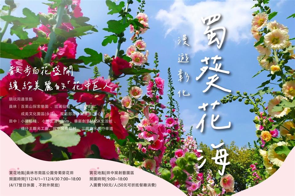 漫遊彰化-蜀葵花海 瀏覽人數: 297人 \\花中巨人// 百花盛開繽紛的蜀葵花海徜徉在熱情綻放的巨人迷宮探訪蜀葵花海彷彿進入一個童話世界綻放在眼前的蜀葵花如同魔法般令人嘆為觀止一起沉浸在這如繪本般浪漫的氛圍中吧!賞花地點|員林市南區公園旁蜀葵花田 開園時間|112/4/1~112/4/30 7:00~18:00(4/17整日休園﹐不對外開放)賞花地點|田中窯創藝園區 開園時間| 9:00~18:00入園費100元/人(50元可折抵餐廳消費)順遊景點|員林:百果山探索樂園 、琉璃仙境 、警察故事館、成美文化園區(永靖) 、魔菇部落休閒農場(埔心)田中:小田稻棧 、小田生活 mmm 、華新創意MASK生活館 、襪仔王觀光工廠、田中窯燒貓村、三鐵跑水自行車道