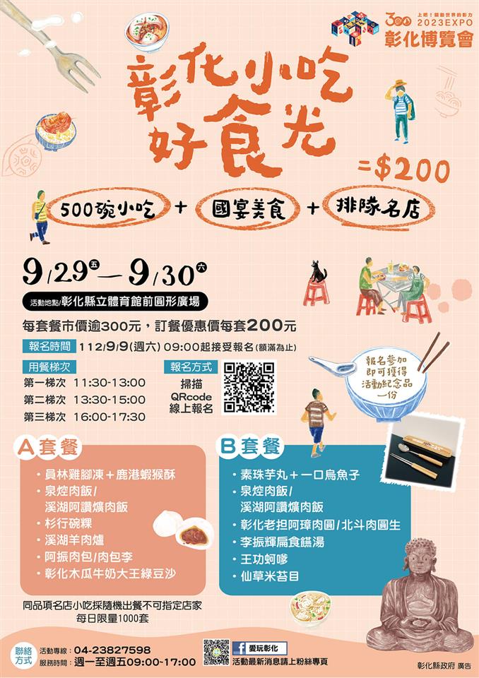 2023彰化小吃好食光 瀏覽人數: 213人 今年欣逢彰化建縣300年,彰化縣政府自9月23日到10月1日,在彰化縣立體育館、體育場舉辦「建縣300彰化博覽會」系列活動,開放網路報名隨即秒殺的「彰化小吃好食光」,9月29、30日在彰化縣立體育館圓型廣場登場,每日限量1000套。 彰化美食聞名遐邇,很多人來到彰化,就是為了要品嚐在地美食小吃,這次,縣府網羅彰化縣人氣最高的排隊美食,推出「彰化小吃好食光」,規劃A、B 兩種不同組合的套餐,網羅榮獲500碗殊榮的彰化小吃的泉焢肉飯、鹿港素珠芋丸、彰化杉行碗粿及肉包李,更有曾登上國宴美食的蚵嗲,還有享譽全台的排隊名店等,不用排隊就可吃遍彰化知名的小吃,讓大家一次嘗到在地美食好滋味。 「彰化小吃好食光」規劃A、B 兩種不同組合的套餐,1份套餐6道小吃,從前菜、主食、副食、湯品、點心、甜點,應有盡有,就是要填飽大家的肚子。A套餐前菜有鬍鬚林雞腳凍及阿南師蝦猴酥,主食分別是泉焢肉飯跟阿讚爌肉飯,副食有杉行碗粿,湯品為溪湖阿清羊肉爐,點心為阿振肉包、肉包李,甜點是木瓜牛奶大王綠豆沙;B套餐的前菜則是鹿港素珠芋丸、一口烏魚子,主食分別是泉爌肉飯跟阿讚爌肉飯,副食是阿璋肉圓、北斗肉圓生,湯品是李振輝扁食湯,點心是蚵嗲、鹿港阿振肉包及彰化肉包李,甜點是仙草米苔目及彰化木瓜牛乳大王的綠豆沙,另外還有熱鬧的表演節目,以音樂佐美食,讓大家一起渡過愉快的中秋佳節。