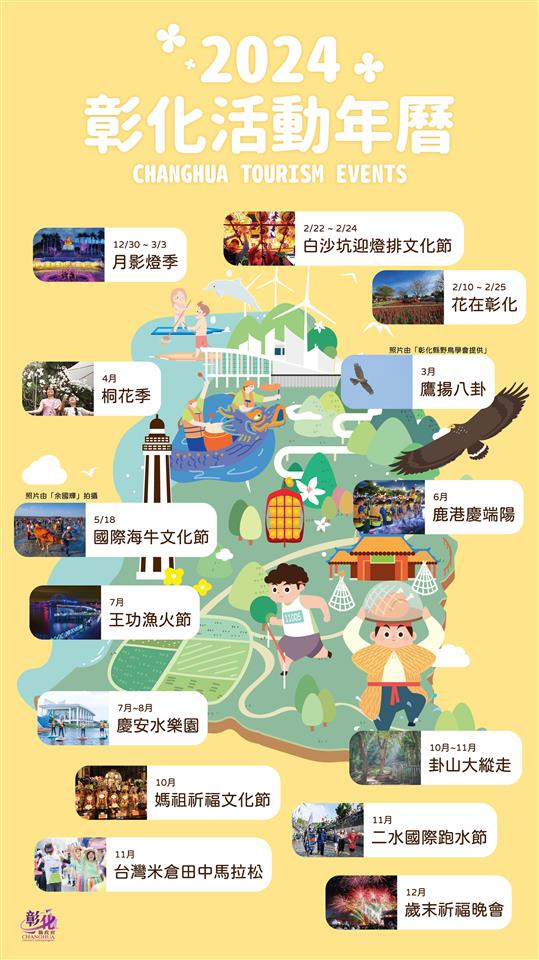2024彰化活動年曆(2024.03) 瀏覽人數: 464人 最強攻略 \ 2024彰化全年度活動年曆來啦!跟著活動玩彰化,一整年都精彩 /從熱鬧慶典、藝文、充滿人情味及挑戰的體育盛事、賞花、賞燈、生態再到觀光,每一場都精彩可期!!現在,就收藏活動年曆吧_彰化旅遊資訊: https://tourism.chcg.gov.tw/