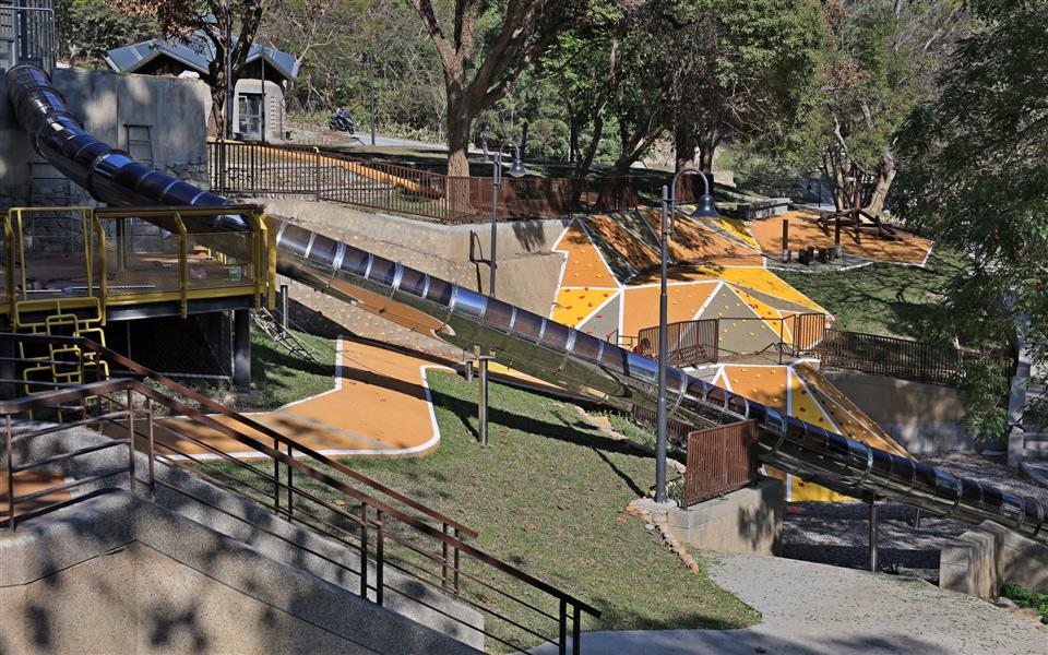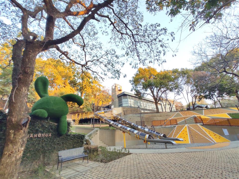八卦山自然生態園區(113.02) 瀏覽人數: 493人 八卦山有座幽谷,彰化縣政府城觀處投入自然工法,營造「自然生態園區」,2024年重啟,一新耳目,不僅有縣內公園滑道高差最大的溜滑梯,2.2公頃園區還串聯「映日池」、「邀月池」、「夕霧綠坡」、「天空之鏡」、「幽谷綠園」等詩意盎然的綠林、花園與交誼廣場,是親子的最愛,也吸引旅人來徜徉、尋幽,予在地人休憩、森呼吸。 自然生態園區位在環著卦山路的山坡谷地,不是一目顯見,過去一直是隱藏版景點,有多條出入口,主要入園通道位在八卦山大佛風景區遊客中心旁,順著緩坡而下,乍見蹦出的大綠兎寶寶,俏皮地要爬上牆頭向遊客們打招呼,歡迎來到親子探索區。 親子探索區利用現有山坡地面,打造滑道高差8.5公尺、長27公尺與高差6公尺、長18公尺的2座色彩豐富的管型滑梯,創下彰化縣高低落差最大的溜滑梯紀錄,讓小朋友盡情享受速度的快感,滑一次肯定不過癮,除了有階梯可爬上再滑一次、又一次,並利用坡面設計攀岩牆和繩索式的波浪攀爬架,讓孩子們發功、奮力攀上滑梯頂,既鍛鍊體能,也增加冒險的新鮮感,在上坡段還有原木打造的平衡跳台與攀爬架可以玩,提供多元體驗。 若沿著卦山路往天空步道2號的路口入園,映入眼簾的映日池,也予人驚艷,大理石砌造的水池,栽植睡蓮、荷蘭鳶尾、紙莎草等多樣水生植物,黑亮滑石與池水,映著天光、雲朵和繽紛花顏,美不勝收,還有眺望景觀台,引人流連,順著階梯執拾而下,進入自然生態園區,沿著綠林小徑,遊走開闊的夕霧綠坡、古樸靜謐的邀月池,多采多姿的陸生和水生植栽串連了一區又一區的花園景觀。 在林蔭步道穿梭,還可照見天空之鏡,如其名,從各個不同角度,幻映樹影和天空的雲彩、飛鳥等,提供不一樣的視覺體驗,再往深處走向幽谷綠園,有參天的鐵板樹、樟樹,形成森林公園,還有各式各樣高大的洋紅、黃花風鈴木、阿勃勒、鳳凰木等花樹,依季節盛放,顯現不同風情。 園區內也保留一座古樸的水泥建造「眾樂亭」,吸引在地民眾前來下棋、泡茶、閒話家常,這等怡然自適的氣氛,亦成最美風景的一部分。園區通往天空步道3號入口處,還有「千禧廣場」,也是在地人清晨爬山運動、聚會的好所在,經常提供義診、量血壓等服務,讓人們感受滿滿的人情味。 八卦山大佛是彰化地標,風景區更是彰化市最大的公園綠地,整體改善後,去除不必要人工設施,讓公園通透明亮,在地居民及遊客更能親近,並新植草皮3324平方公尺、灌木約46000株,使園區整體綠覆率多達75%,繁衍多樣的自然生態,吸引各種蝴蝶等昆蟲和蛙類棲息、生氣盎然。並連結卦山村、天空步道、成功營區綠色學習園地、台語文創意園區及美學館,是八卦山風景區的新亮點。