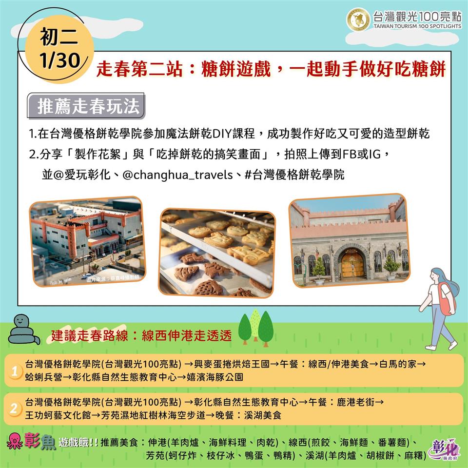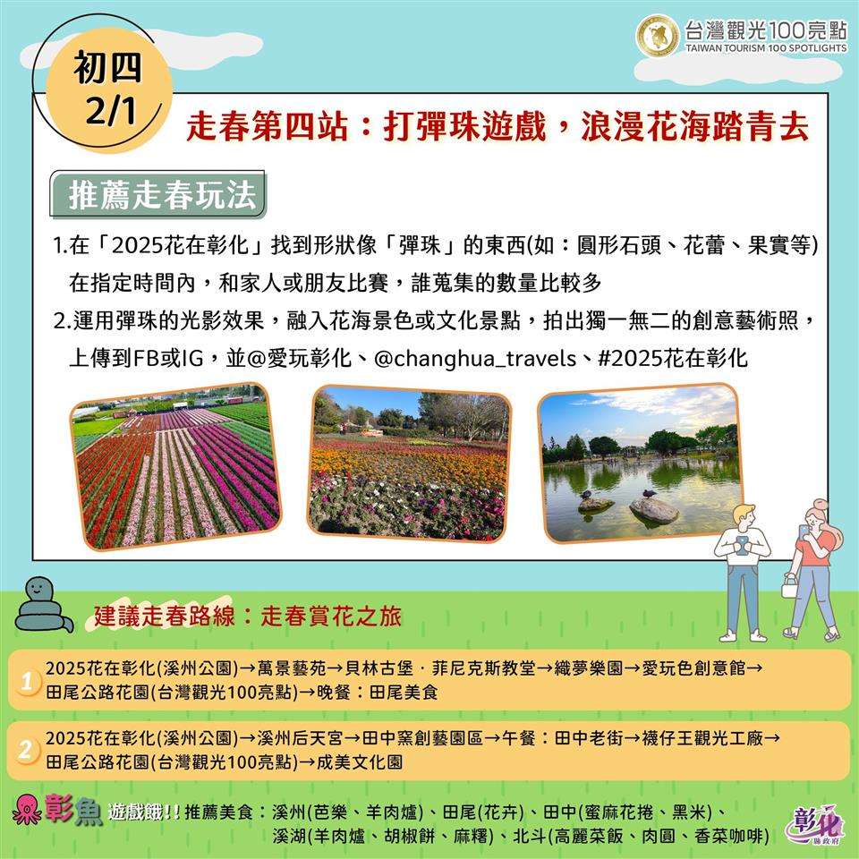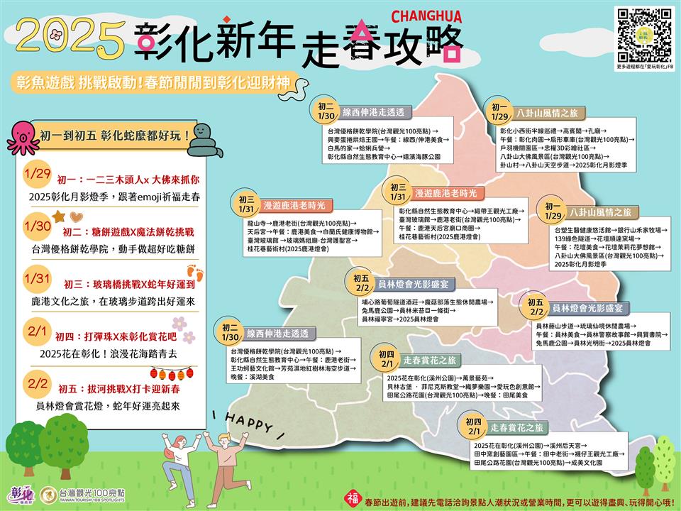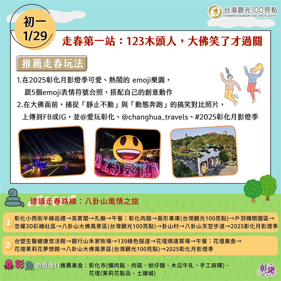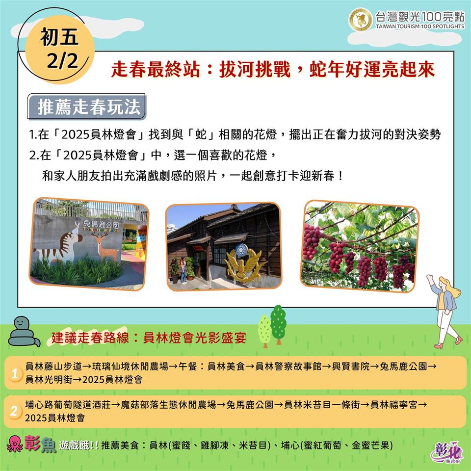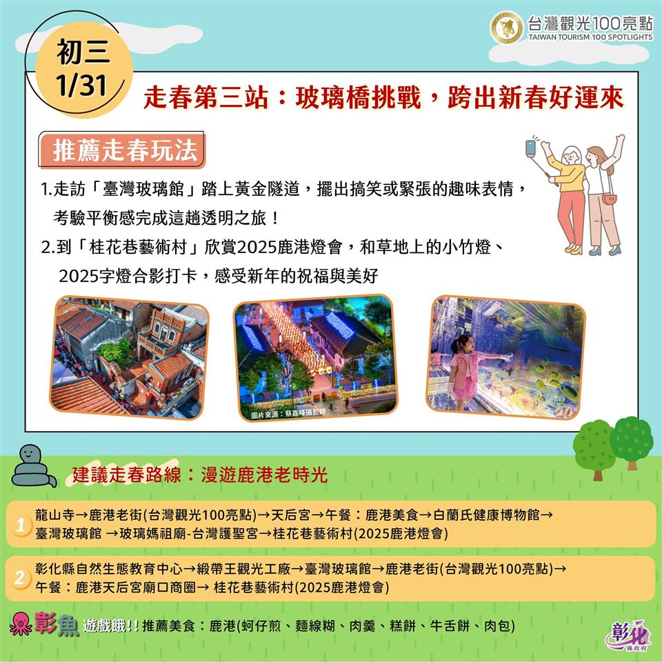 2025彰化走春攻略-彰魚遊戲 挑戰啟動(2025.01) 瀏覽人數: 231人 \\ 台灣觀光100亮點𝙓 #2025彰化新年走春攻略//跟著 彰魚遊戲 創意走春從初一到初五,走遍 台灣觀光100亮點 彰化精彩景點~讓你怎麼玩都開心、蛇麼都好玩亮點活動:123木頭人 X 大佛來抓你2025彰化月影燈季,跟著emoji祈福走春!糖餅遊戲 X 魔法餅乾挑戰台灣優格餅乾學院,動手做餅乾 甜蜜過新年玻璃橋挑戰 X 蛇年好運到來趟 鹿港文化之旅,台灣玻璃館跨出好運打彈珠 X 來彰化賞花吧花在彰化,溪州公園浪漫花海拍美照拔河挑戰 X 打卡迎新春員林賞花燈,新的一年好運亮起來精彩走春行程推薦:八卦山風情之旅、線西伸港走透透、漫遊鹿港老時光員林燈會、花在彰化等多種路線,一起來彰化歡度蛇年!更多遊程資訊|https://tourism.chcg.gov.tw/