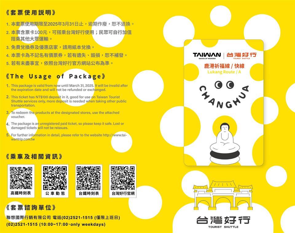 2025彰化月影燈季𝙓 #台灣好行超值套票 ✨ 鹿港祈福線超值套票 限量發行.ᐟ.ᐟ(114.01) 瀏覽人數: 193人 超值內容:✦#2025彰化月影燈季 特別版交通卡1張(iPASS一卡通,含100元儲值金)✦伴手禮抵用券200元✦文創商品抵用券150元✦彰化肉圓兌換券1張✦60家優惠店家專屬優惠券1本原價650元,超值優惠價 #只要300元,讓你一票在手吃喝玩樂通通有開賣時間:𝟭𝟭𝟰/𝟬𝟭/𝟮𝟯限量300份,每人限購4套,售完為止!購買連結:https://reurl.cc/lN4dpQ𓍲 𓍱 𓍲 𓍱 𓍲 𓍱 𓍲 𓍱 𓍲 𓍱 𓍲 𓍱 𓍲 𓍱 𓍲 𓍱 𓍲 𓍱 𓍲 𓍱 𓍲 𓍱 𓍲 𓍱 𓍲 𓍱 𓍲 最近大家有捕捉到換裝登場的 #彰化八卦山18路公車 和 #八卦山大佛風景區遊客中心 嗎~滿滿黃色點點的外型超吸睛,一起搭乘18路公車抵達月影燈季現場,展開屬於你的半線小旅行吧!公車行駛資訊:https://reurl.cc/04KEAK✦彰化爌肉飯兌換券 1張