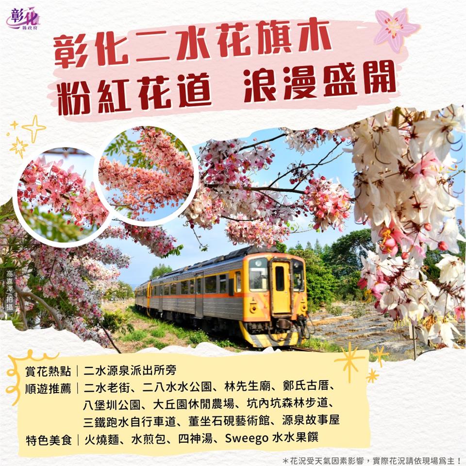 彰化賞花情報|二水花旗木 粉紅鐵道再現.ᐟ.ᐟ 瀏覽人數: 127人 走進春天的粉色濾鏡,一起追花去花旗木 有個浪漫的別名叫 桃花陣雨樹粉白花瓣如雲般覆蓋枝頭、交織著桃紅花萼~每年春天,花樹沿著集集線鐵道齊放宛如走入一幅動人的春日風景畫當火車緩緩駛過 與花旗木同框的畫面更是攝影迷心中的神級場警這樣的美景,絕對值得你來朝聖#賞花熱點|二水鄉源泉派出所旁#順遊景點|二水老街、二八水水公園、林先生廟、鄭氏古厝、八堡圳公園、大丘園休閒農場、坑內坑森林步道、三鐵跑水自行車道、董坐石硯藝術館、源泉故事屋 #特色美食|火燒麵、水煎包、四神湯、Sweego 水水果饌拍照、放空、散步,來趟悠閒的二水輕旅行一起捕捉粉嫩花旗木的浪漫時刻 ♡♡♡更多旅遊資訊https://reurl.cc/eMDM4j賞花提醒:花況受天氣影響,實際狀況請依現場為主,賞花拍照也要注意安全哦.ᐟ.ᐟ感謝 臉書網友 葉錦達 授權提供照片