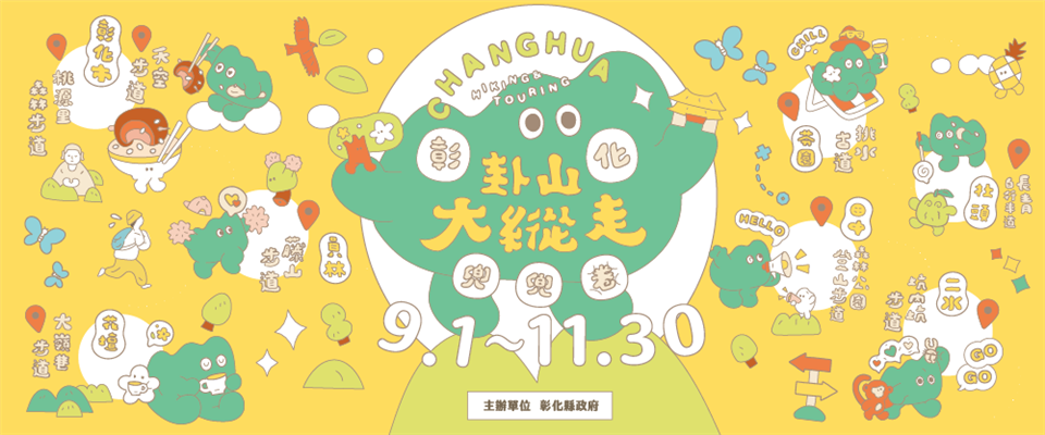 2025卦山大縱走 瀏覽人數: 81人 彰化縣政府規劃「卦山大縱走 彰化兜兜圈」步道健行活動,本活動自9月1日至11月30日熱鬧登場,邀請民眾縱走八卦山8條登山步道,包含彰化八卦山天空步道、桃源里森林步道、員林藤山步道、花壇大嶺巷步道、芬園挑水古道、社頭長青步道、田中森林公園步道、二水坑內坑步道,只要上網報名並完登步道,就可以獲得限量版完登禮及抽大獎,同時到各鄉鎮市旅行,感受最動人的在地美食及特色伴手禮。 經過多年努力,「卦山大縱走 彰化兜兜圈」已被打造成彰化的知名品牌。彰化好山好水,精心規劃8條風景秀麗的步道,推薦給鄉親。今年活動有五大亮點: 第一個,「小山怪+快樂小夥伴登山趣」,今年小山怪邀請好朋友小小樹、油桐花、芭樂籽、爌肉寶、獨角仙、小獼猴、米寶貝、鳳梨寶8位快樂小夥伴,天天陪你走步道,出沒在八卦山步道上的小山怪,特別喜歡跟登山民眾拍照合影,好客、愛玩,最愛邀請大家到八卦山步道運動,只要到步道上開啟LINE愛玩彰化-卦山大縱走活動集章功能,就能捕捉小山怪及快樂小夥伴,趣味滿滿! 第二個,「特約店家商品優惠」,活動邀請彰化百家特約店家共同參與,結合在地優質農特產、美食、住宿、伴手禮等,都享有優惠,邀請大家來彰化兜兜圈。 第三個,「限量版紀念徽章及雞蛋糕」,只要活動當日完登步道,便能領取限量版紀念勳章,8款不同造型的紀念徽章,有挑戰每條步道的回憶,都是獨一無二的收藏。還有限量版小山怪及快樂小夥伴雞蛋糕,不僅是傳統結合創新風味的小吃,也承載許多人的童年回憶。 第四個,「完登步道抽大獎」,走完4條步道就有1次抽獎機會,走完8條有2次抽獎機會,最大獎是「台中–韓國四日遊」,還有住宿券、SWITCH遊戲機、運動手環、GOpro、伴手禮等好禮,通通讓你帶回家。 第五個,「加碼設計展抽獎機會」,配合彰化設計展在彰化,提供報名參加卦山大縱走活動者,順遊台灣設計展2個場館,加碼額外獲得1組抽獎序號。 自9月1日起開放報名的有:9/13挑水古道(芬園鄉)、9/27桃源里森林步道(彰化市);自10月1日起開放報名的有:10/18天空步道(彰化市)、10/25田中森林公園登山步道(田中鎮);自11月1日起開放報名的有:11/8大嶺巷步道(花壇鄉)、11/15長青步道(社頭鄉)、11/22藤山步道(員林市)、11/29坑內坑步道(二水鄉)。活動官網