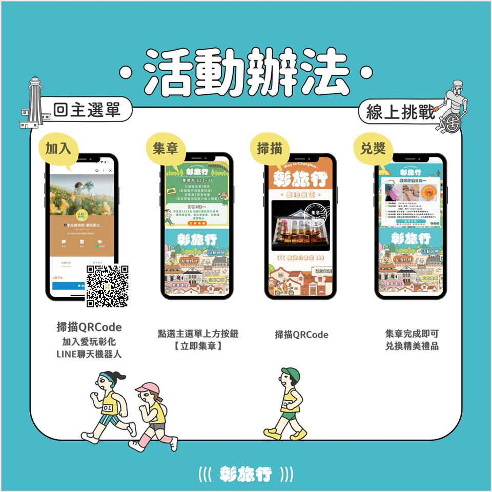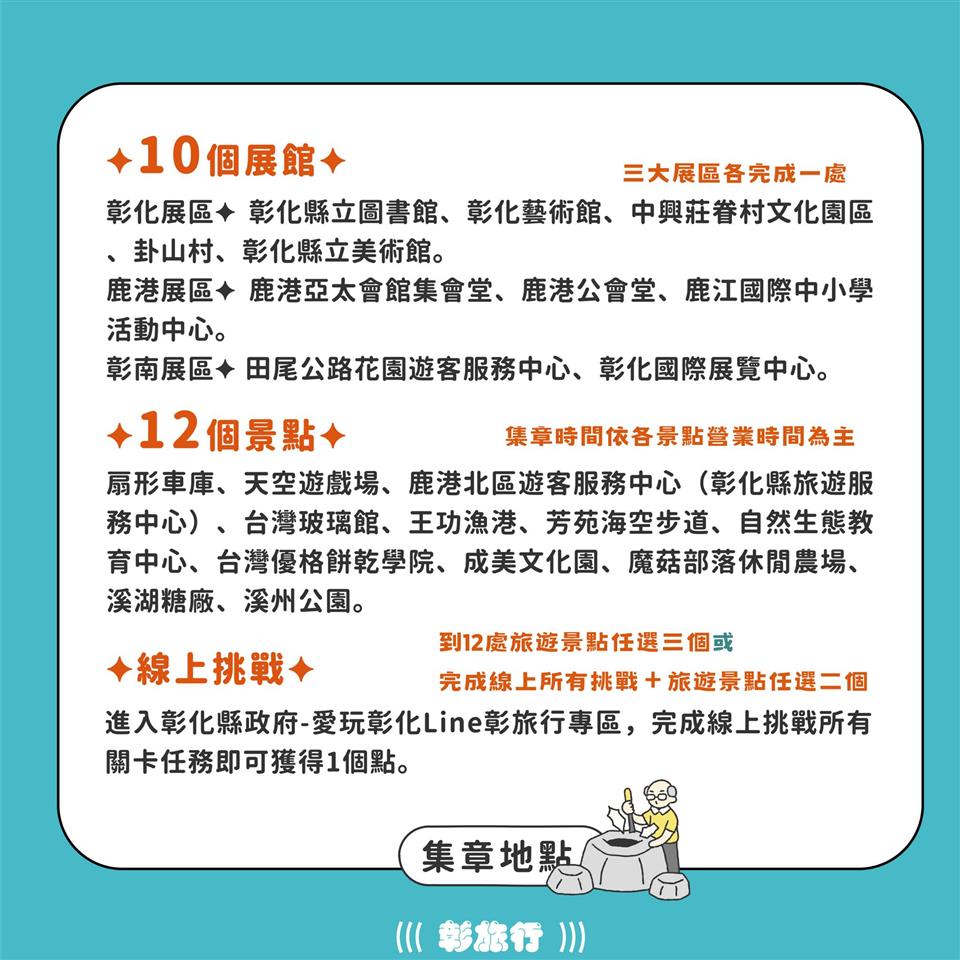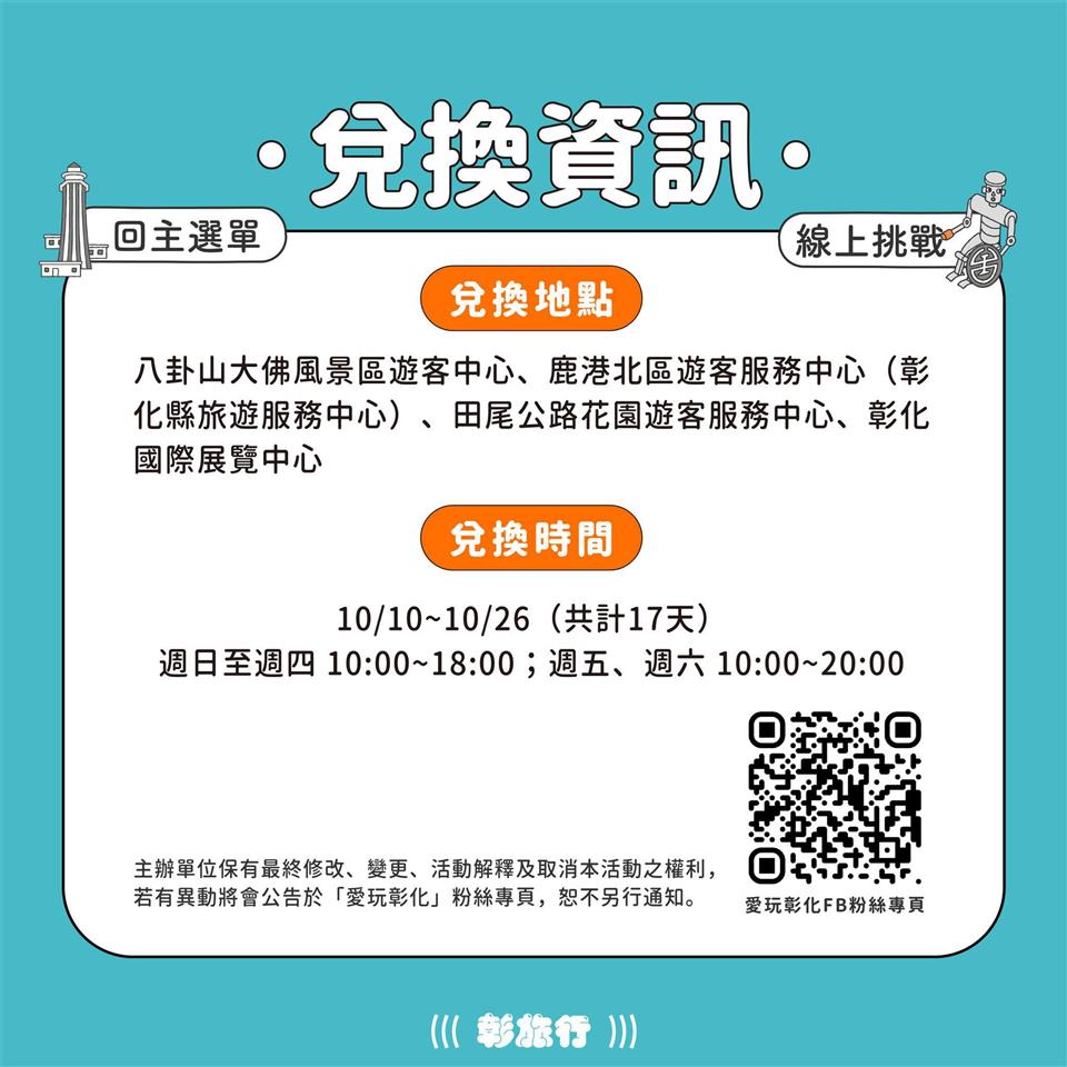 2025台灣設計展-彰旅行數位集章3+3活動 瀏覽人數: 42人 走進展館,也走進城市2025 台灣設計展 × 彰旅行集章活動 即將開跑!只要完成「3+3 挑戰」—— 三大展區集章 + 三個旅遊景點或線上挑戰就能獲得彰化限定好禮【彰旅行三寶】! 彰旅行三寶(首波好禮) 果然真好袋 靈感與材料來自彰化在地,充滿地方味的設計手提袋。 炕飽襪 將彰化人氣小吃「腿庫飯」的元素融入設計,趣味十足的創意襪。 扇形車庫扇 以彰化特色「扇形車庫」為意象製成的木柄圓扇,實用又具紀念價值。 集章地點一覽展館集章點(共10處)彰化展區 • 彰化縣立圖書館 • 彰化藝術館 • 中興莊眷村文化園區 • 彰化縣立美術館 • 卦山村(八卦山大佛風景區遊客中心)鹿港展區 • 亞太鹿港渡假村集會堂 • 鹿港公會堂 • 鹿江國際中小學彰南展區 • 田尾公路花園遊客服務中心 • 彰化國際展覽中心旅遊景點集章點(共12處) • 扇形車庫 • 八卦山天空遊戲場 • 鹿港北區遊客服務中心(彰化縣旅遊服務中心) • 臺灣玻璃館 • 王功漁港 • 芳苑海空步道 • 成美文化園 • 魔菇部落休閒農場 • 溪湖糖廠 • 溪州公園 • 彰化縣自然生態教育中心 • 台灣優格餅乾學院 貼心提醒 別忘了參加「愛玩彰化 LINE 彰旅行專區」的 線上挑戰,也能獲得1顆章喔! 集章與兌換期間時間:114年10月10日 ~ 10月26日 • 週日~週四:10:00-18:00 • 週五、週六:10:00-20:00 兌換地點(4處) 1. 卦山村(八卦山大佛風景區遊客中心) 2. 鹿港北區遊客服務中心(彰化縣旅遊服務中心) 3. 田尾公路花園遊客服務中心 4. 彰化國際展覽中心2025 台灣設計展 在彰化全彰化都是你的設計展現場!趁著好天氣,一邊逛展、一邊集章,把創意的設計與旅行的回憶,一次打包帶走! 打開「彰化縣政府-愛玩彰化」LINE 官方帳號,馬上參加活動吧!https://lin.ee/Foe6htE